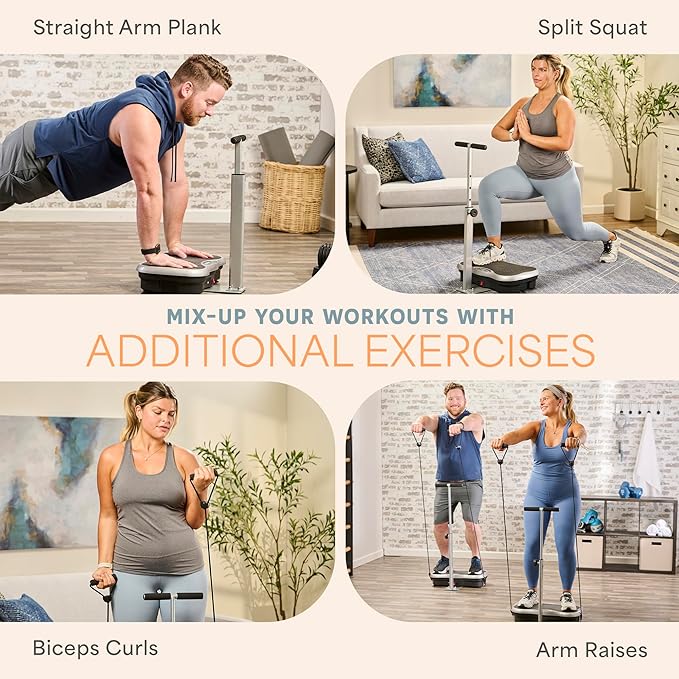 - SAFELY BUILD ARM MUSCLE - The TrimLite Vibration Plate Exercise Machine includes waist-high adjustable handlebars you can set between 27.4" & 38.6" high, & resistance bands to maximize your arm workouts.