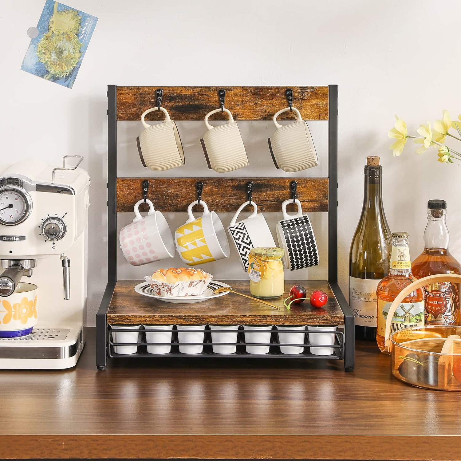 - Multi function: The product can store coffee capsules and mugs, and the panel can also be used as the storage space for coffee beans or coffee machine. The cup holder can hang seven cups of water, and the drawer can store 30-40 capsules of coffee.