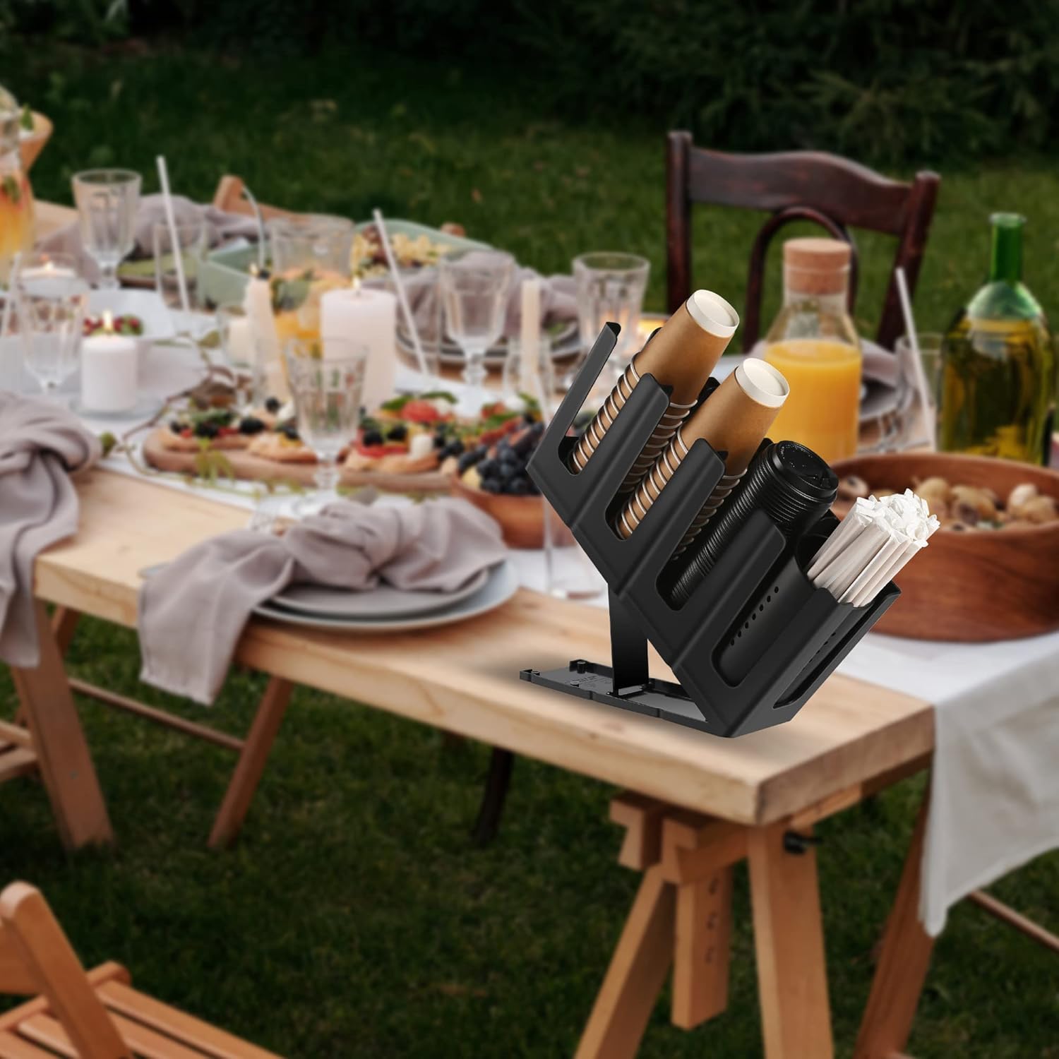 Paper Cup and Lid Holder with Straw Organizer, Disposable Coffee Cup Dispenser for Countertop Coffee Station Bar Restaurant Breakroom, Black