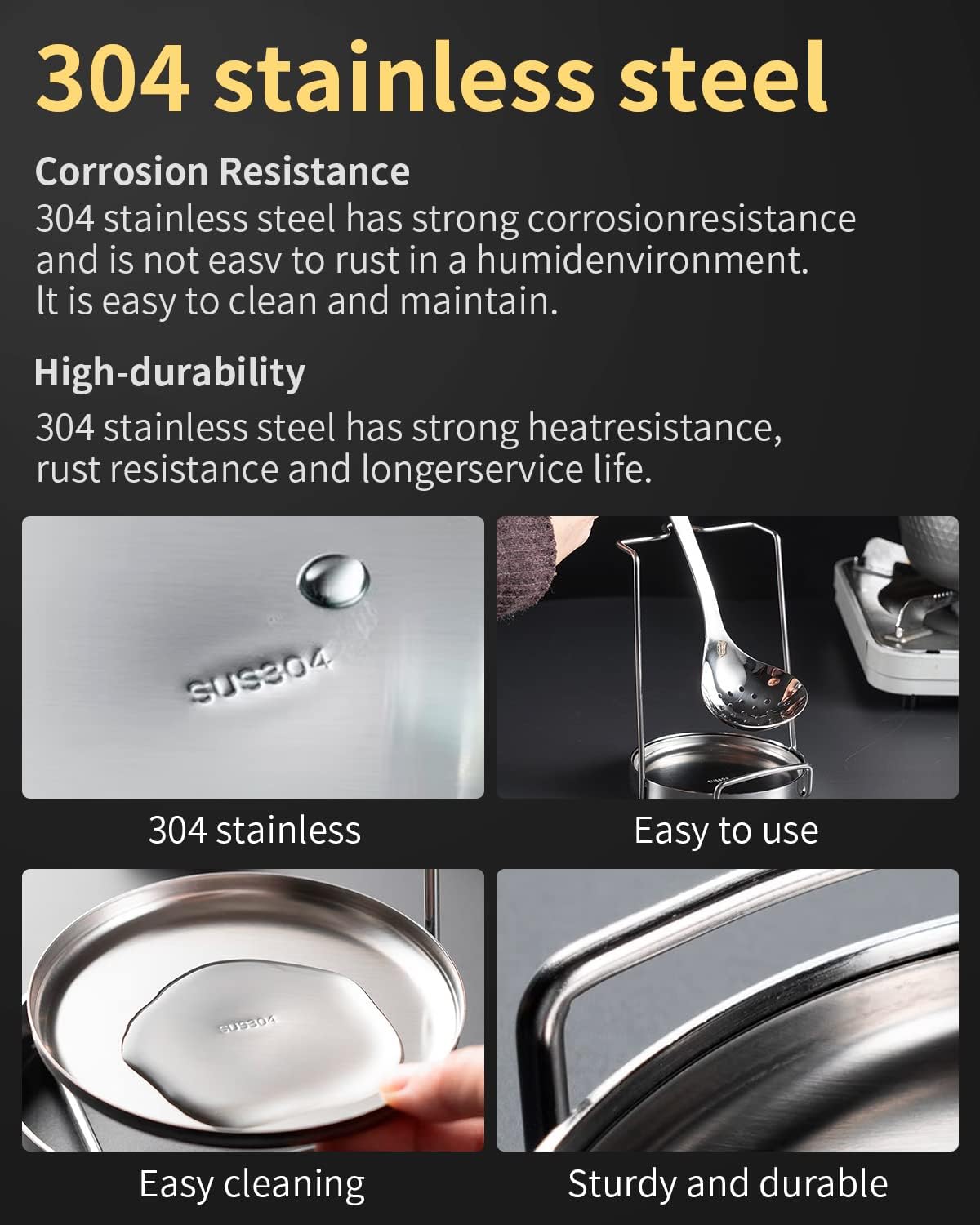 - DURABLE: Lid Stand made of 304 stainless steel.The material is rustproof ,non-stick, non-corrosiveand waterproof.Which will not turn yellow or crack, and the service life will be longer.It is durable enough to hold any of your kitchen utensils, even if hot or wet.