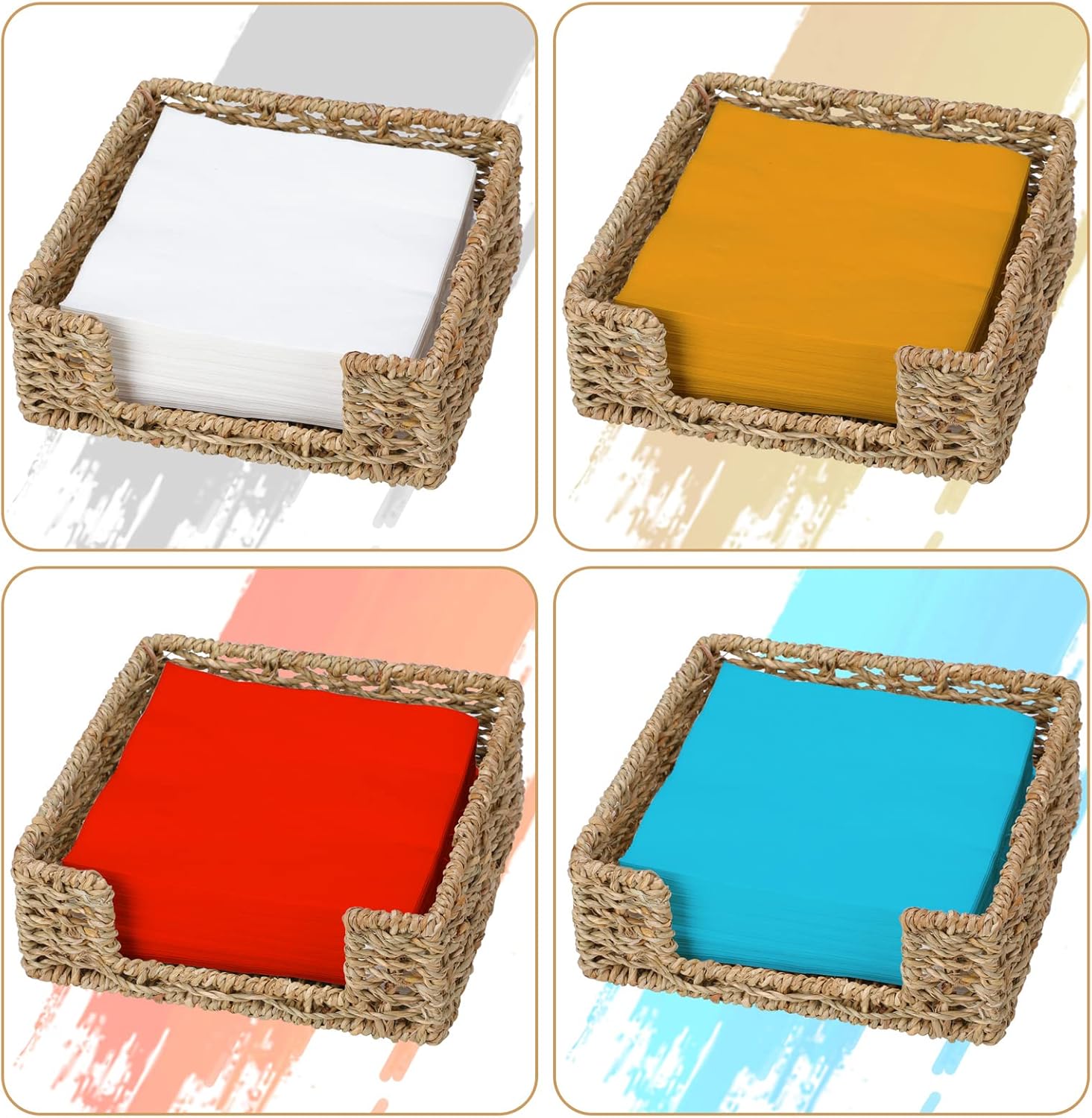 - ✅[Size] The napkin holder is 7.8"L x 7.8"W x 2.8"H, size may vary within 1/4 inch due to handwoven design. Each napkin holder is about 0.5 lb and can hold 100 napkins, also can be a perfect choice for lunch, dinner, cocktail, table, counter, home kitchen, restaurant, bar, decoration, etc.