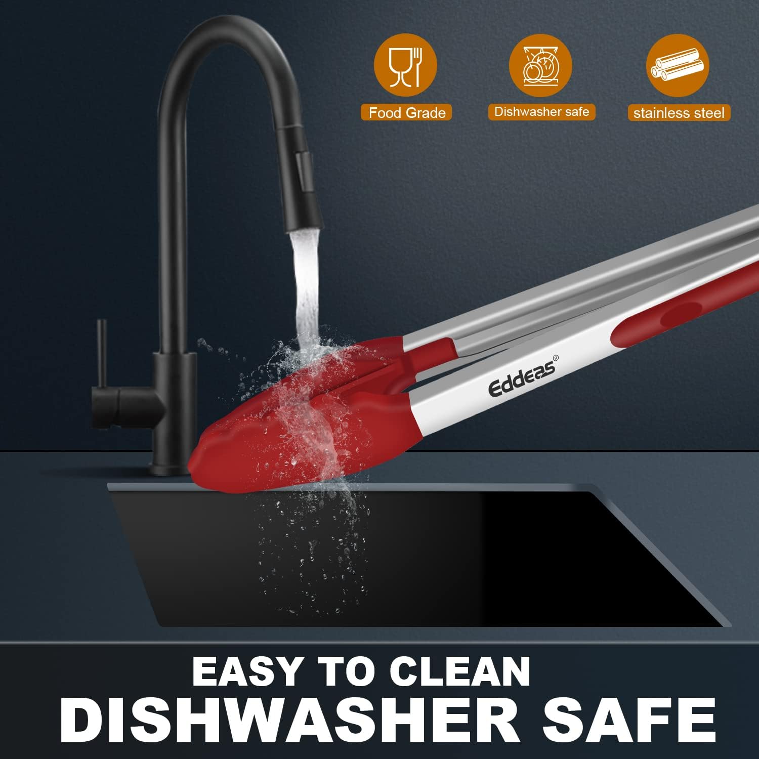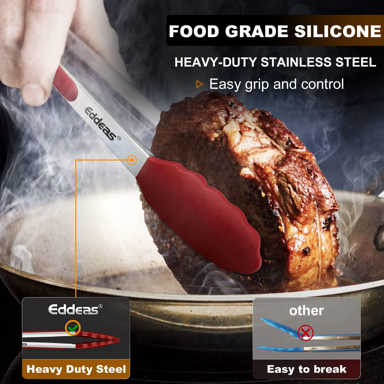 - EDDEAS NON STICK SILICONE TIP, Silicone KitchenTongs for Cooking won't MELT, RUST OR FLAKE-The tip is made of food-grade silicone, which is safety-tested, heat resistant up to 480°F . Food tongs with non-stick silicone tips protect your cookware from damage, easy to clean and dishwasher safe.