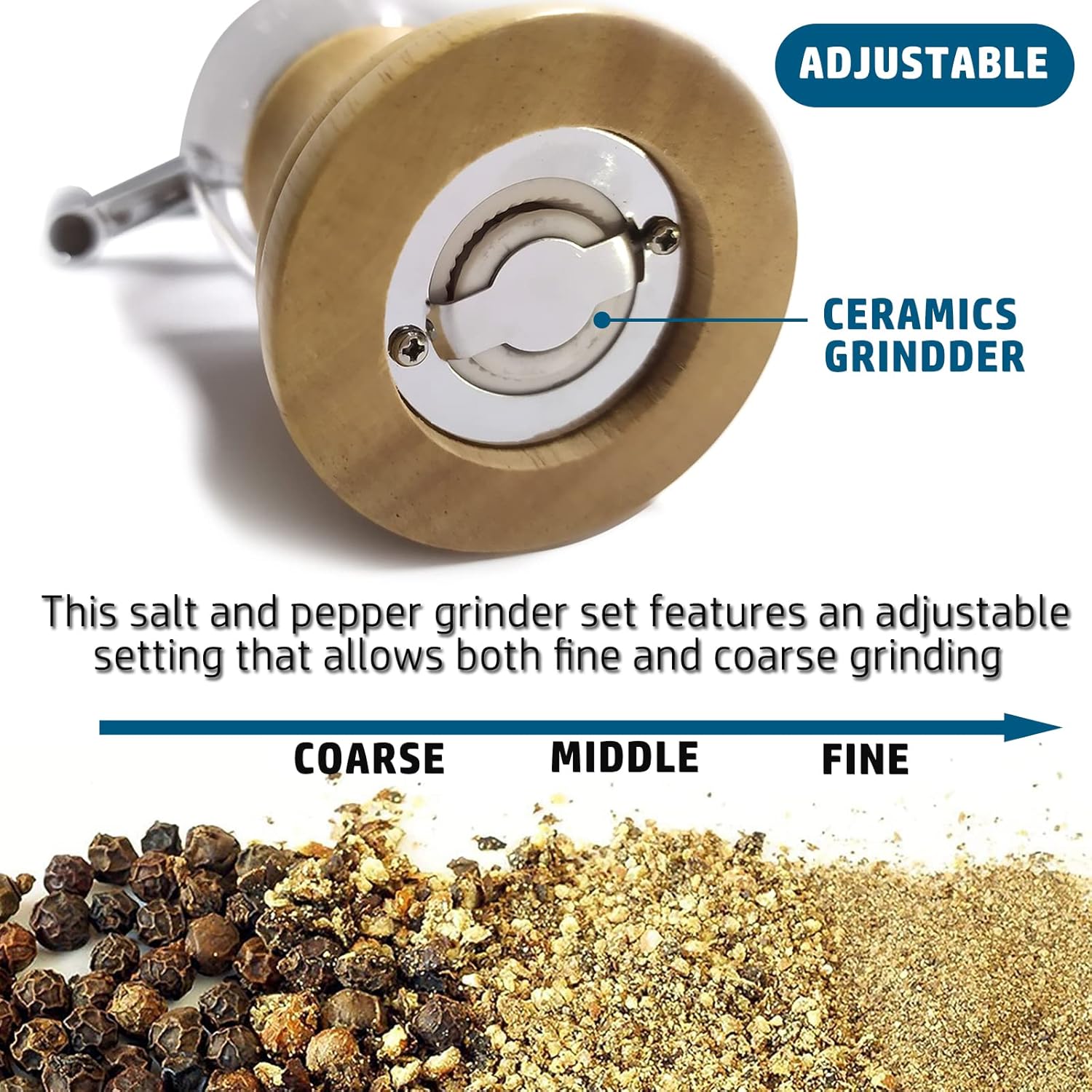 Pepper Mill Set, Classical Hand Shake Wood Pepper Grinder Set & Salt Mill, Wooden & Acrylic,Ceramic Blades Upgrade Metal Handle,Enjoy Fresh Ground Pepper Various Spices (Burlywood 2pcs-5in)