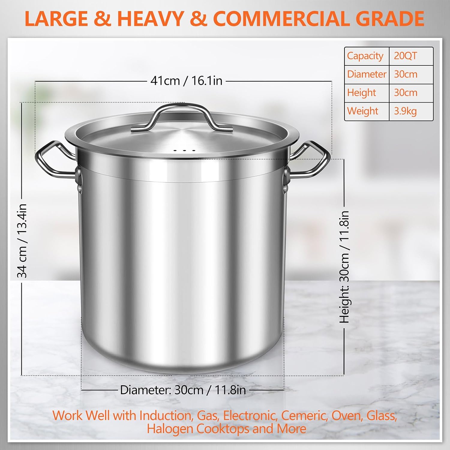 Stock Pot 20 Quart - Stainless Steel Stock Pot with Lid – Heavy-Duty Cooking Pot for Soup, Stew, Pasta – Commercial & Home Use, Induction Compatible - 5 Gallon
