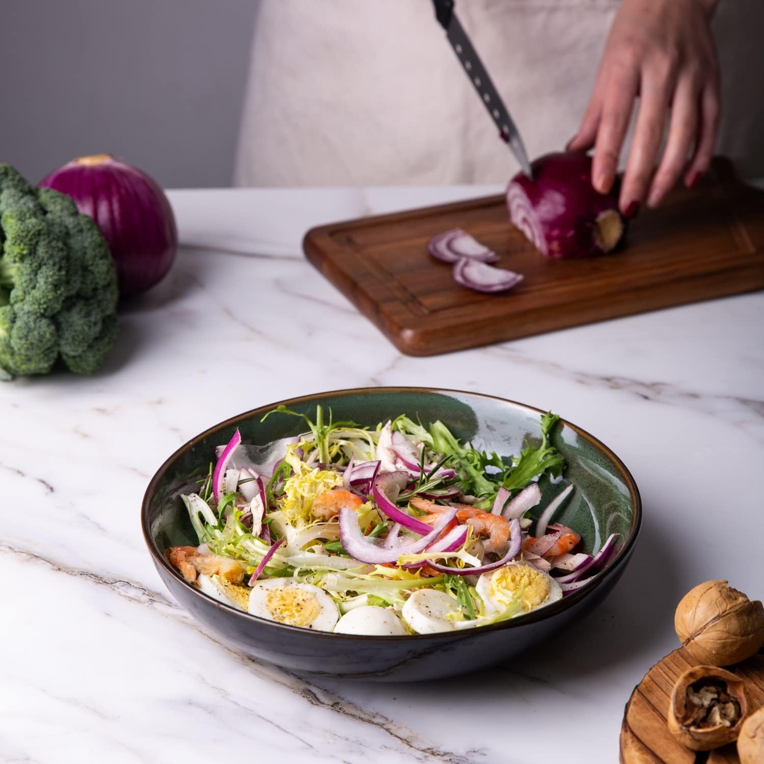 - 【UNIQUE AND SCRATCH RESISTANT】 Our bowls sets are fired with two different glazes,The reactive glaze make every plate is unique,Since our glaze is all-natural reactive finish, the surface of plates would change color on lighting,So Our glaze is also extra strong to prevent scratches from your knives and forks .