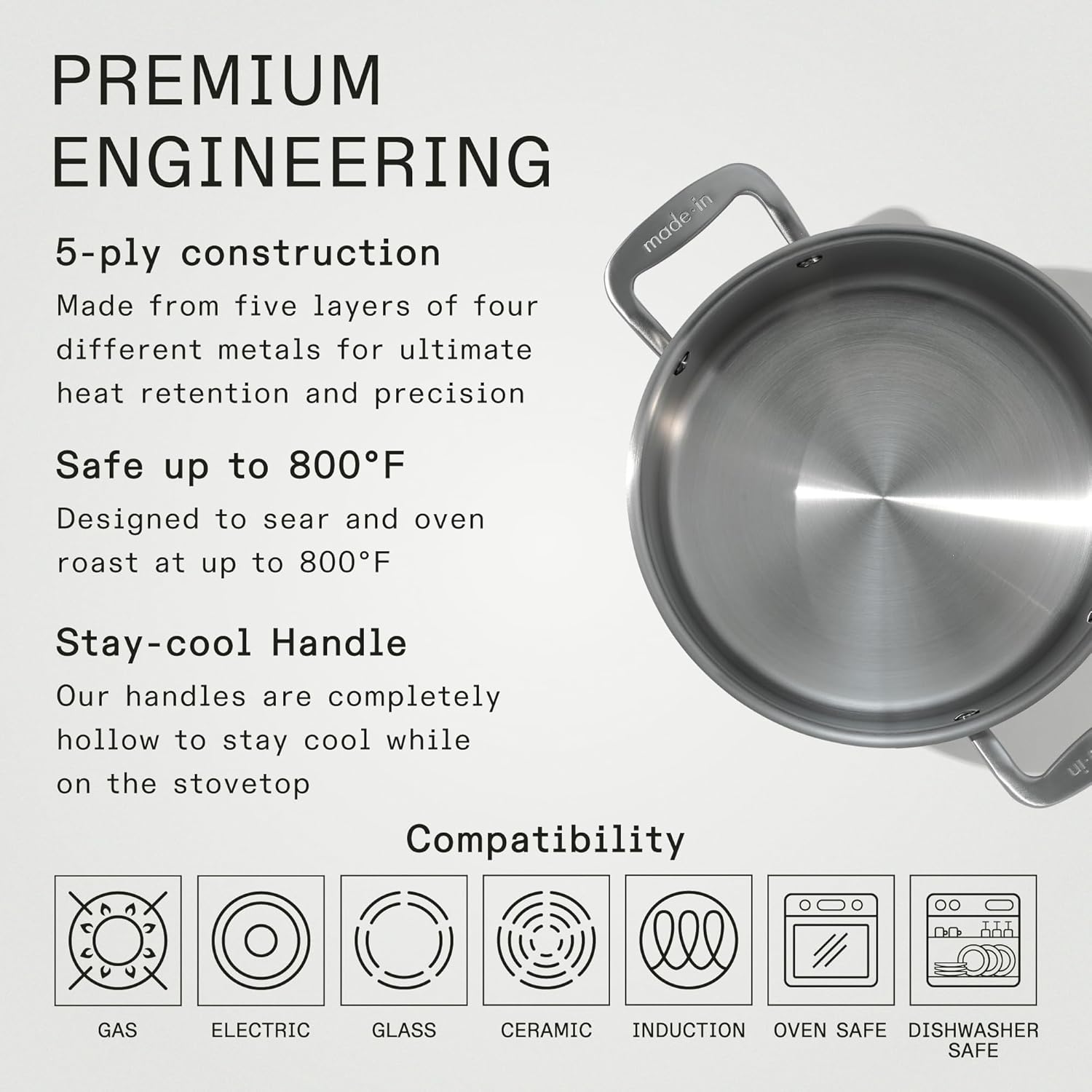 - Induction Cooktop Compatible - With a top layer of 430 stainless steel, these Stainless Clad Pots and Pans work effortlessly with any cooktop, including induction