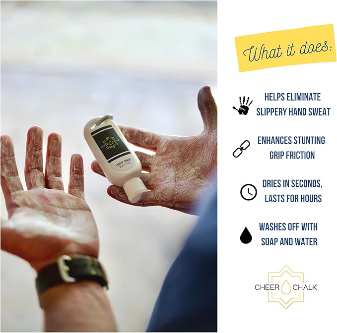 - QUICK-DRYING + LONG-LASTING ~ Cheer Chalk was formulated to meet the demands of elite cheerleading athletes. Quick drying agents bind the magnesium to the skin, and form a long-lasting bonds that leave your hands grippy and dry for hours, through the most intense workouts, practices and performances.