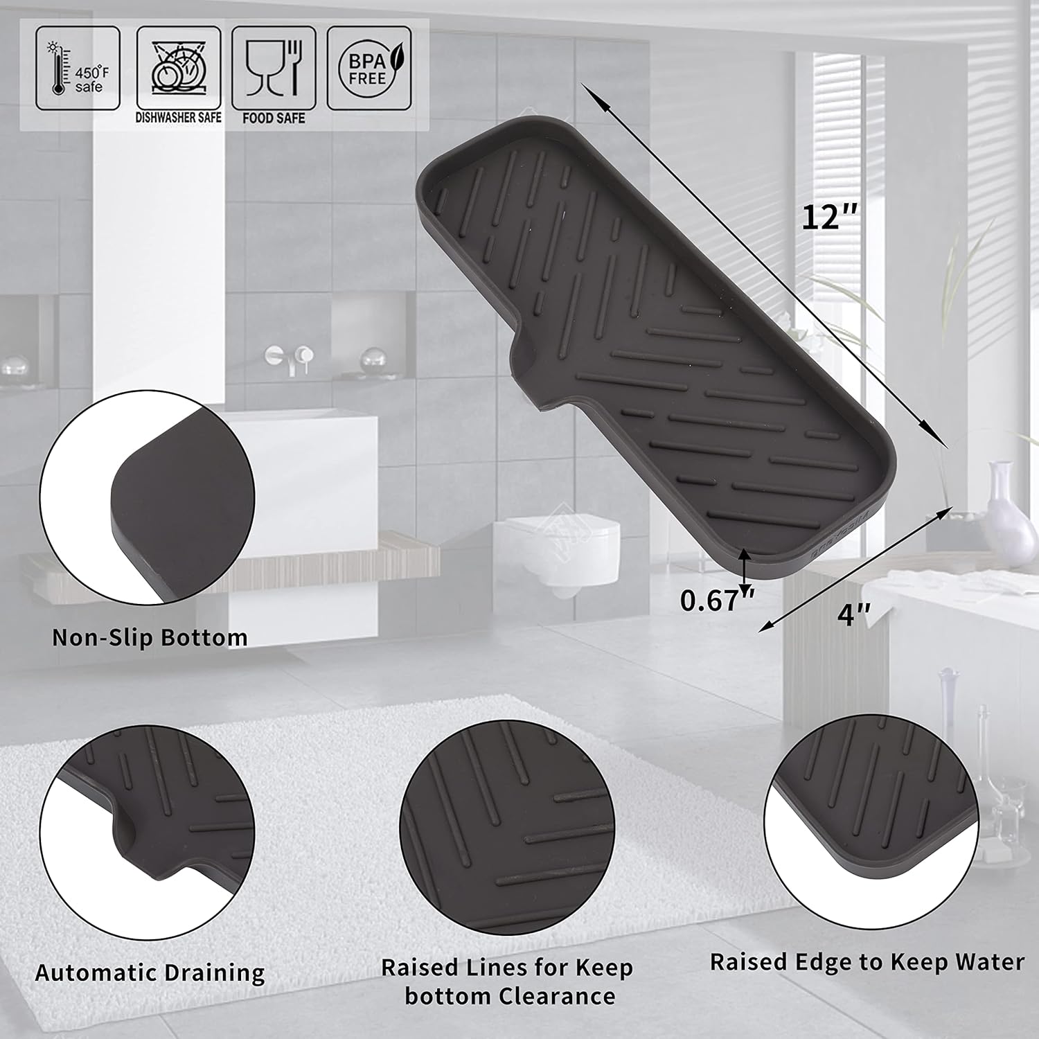 - Food Grade Silicone: The soap dispenser tray is made from high-quality food grade silicone, so it's safe for use in the kitchen or bathroom