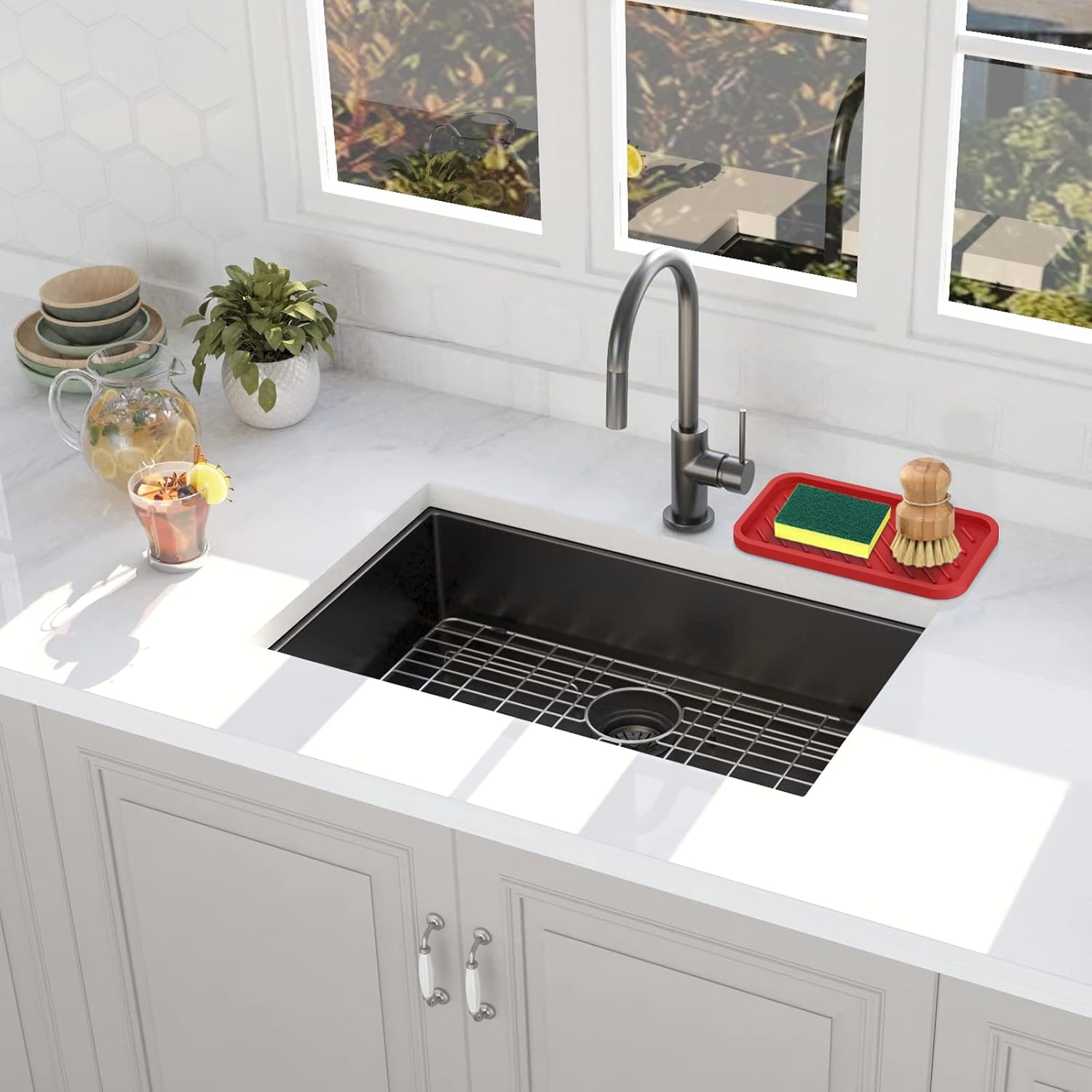 - 【99.99% Purity Silicone】Our kitchen sink organizer tray is produced by high-purity silicone, the main characteristics of silicone are: no odor, good flexibility, comfortable touch, non-slip, not easy to deform, no discoloration, heat resistance, good product quality, beautiful, stable, long service life.