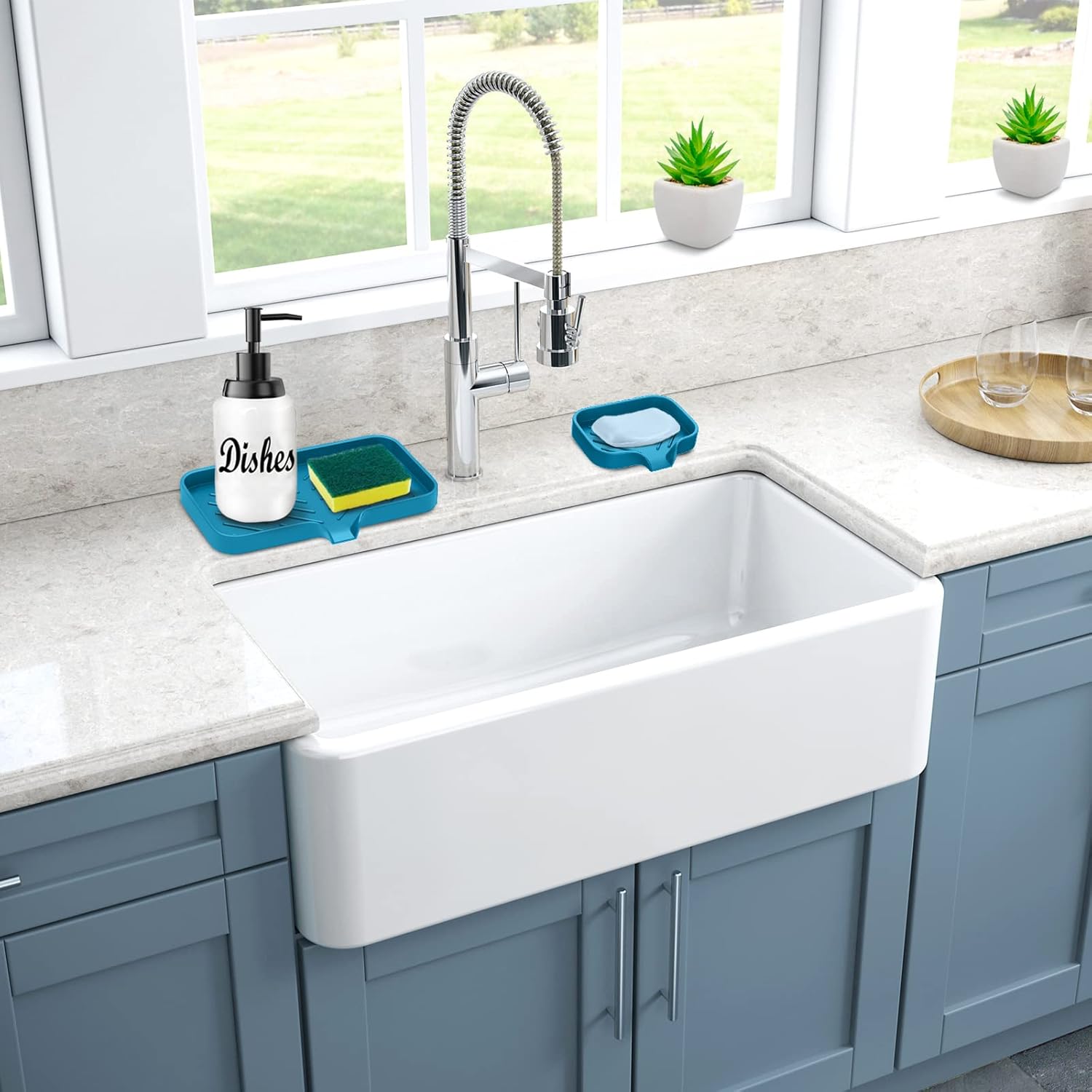 - Convenient Sink Tray Set: Includes one large sink sponge holder, size: 9.6*5.3 in, two small soap holder for bathroom sink, size: 4.9*3.2 in.Please note the size before order to ensure that this silicone sink tray fits your kitchen or bathroom counter.
