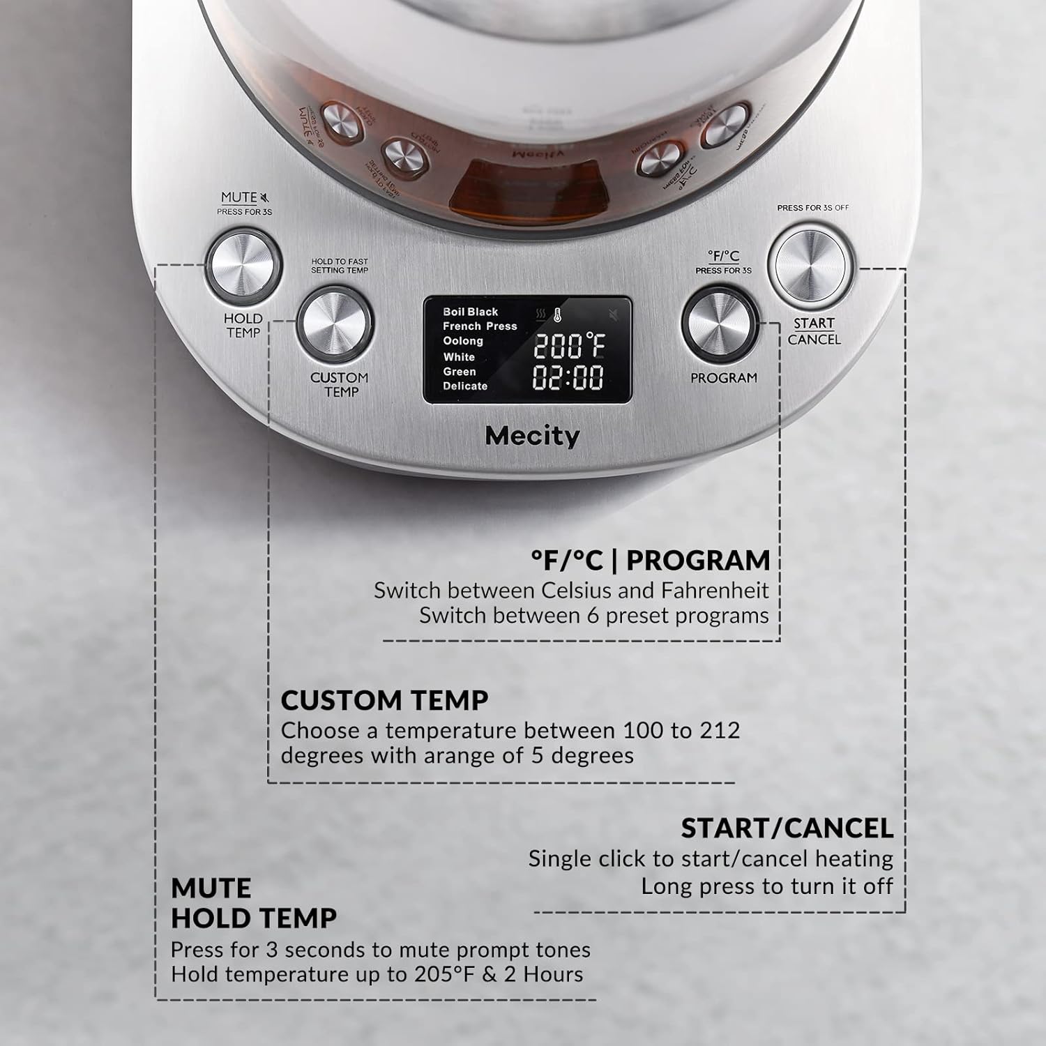 - Special Feature : 10 Min Auto Keep Warm, 100-212°F Custom Temperature, 2 Hour Hold Temperature, 6 Preset Programs, Removable Tea Infuser 10 Min Auto Keep Warm, 100-212°F Custom Temperature, 2 Hour Hold Temperature, 6 Preset Programs, Removable Tea Infuser