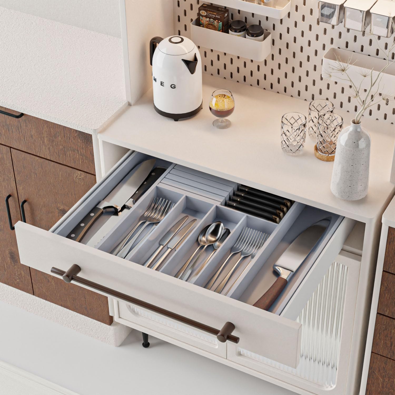 - 【3-in-1 Organizer】: Kitchen Drawer organizer with steak knife holder, no assembly required. It can store kitchen utensils, knives and silverware together, which can effectively complete the kitchen organization work and keep your tableware in order, beautiful and tidy.