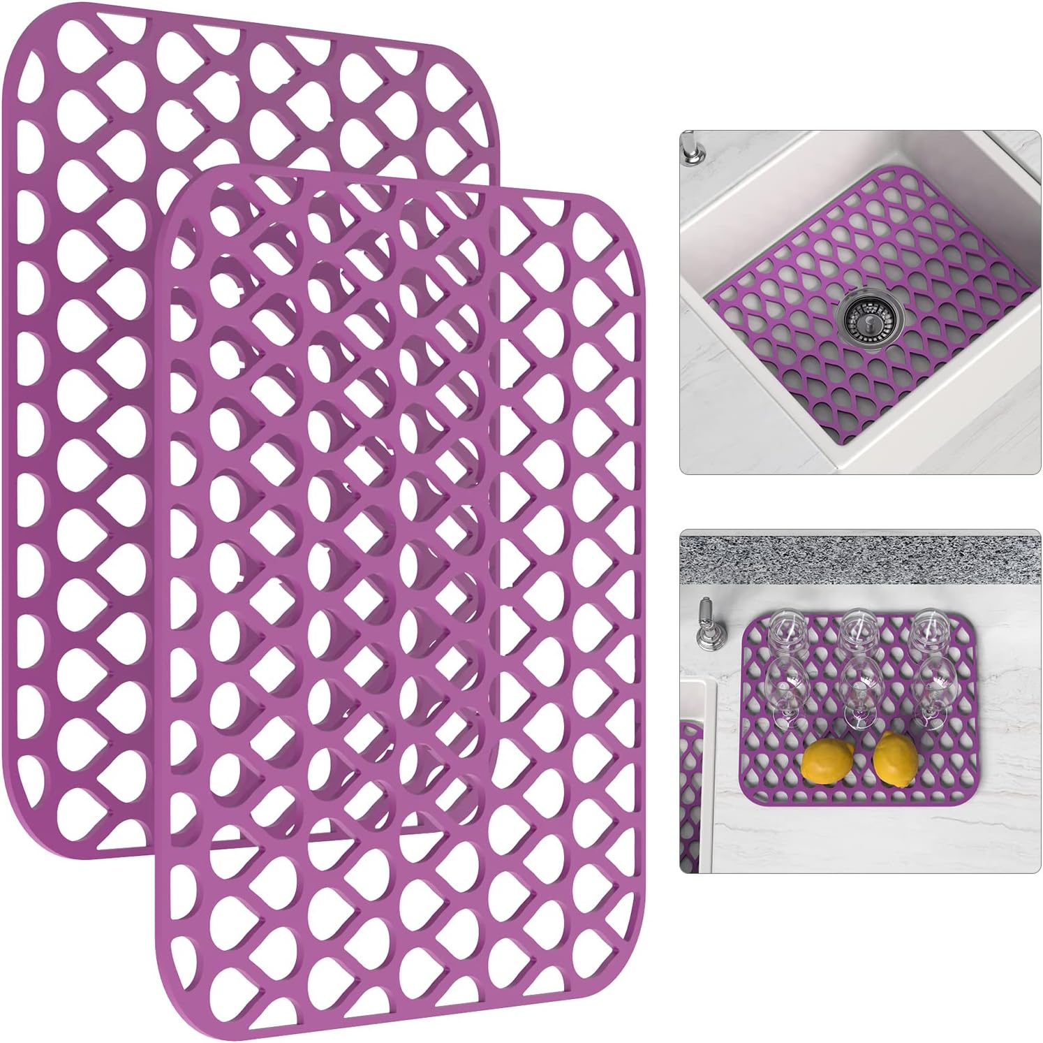 Sink Protectors for Kitchen Sink, 13.58"x 11.6" 2PCS Dish Rack, Protect from Stains, Damage, Scratches, Dishwasher Safe Grid, Silicone Mat for Kitchen Purple
