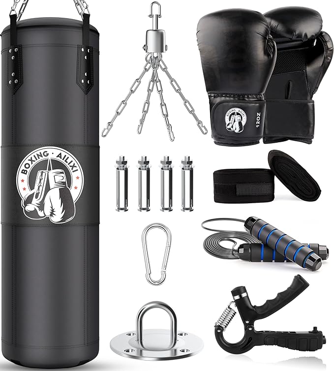 - 【Package Including】A complete set of boxing accessories brings the ultimate experience. they contain 1 x 4ft unfilled punching bag, 1 x 12oz boxing gloves, 1 x steel chain, 1 x connecting carabiner, 1 x boxing bag hanger, 1 x jumping rope, 1 pair Wrist band, 1 x counting grip.