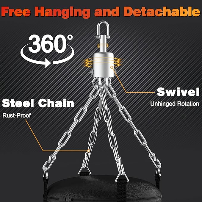 - 【Stainless Steel Heavy Duty Hanger】360°Rotating hook, flexible hitting, free hanging and detachable, easy to assemble. This punching bag set, with 4 expansion bolts and a carabiner, rust-proof thickened stainless steel chain, strong and safe, can bear up to 1000 lbs!