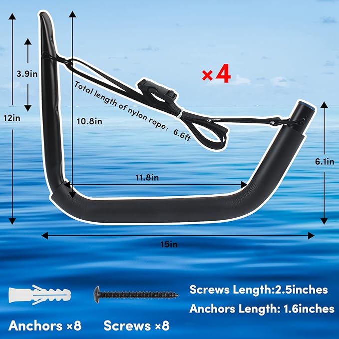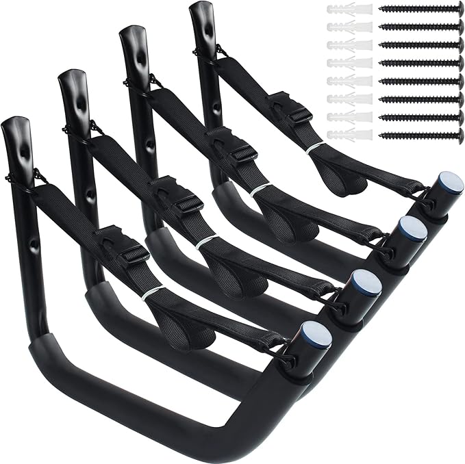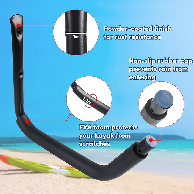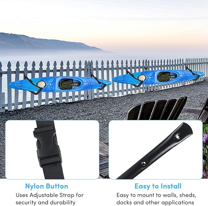 - 【Safe and Reliable】 Each kayak wall rack has a 5mm thick EVA foam protective pad to protect your kayak or stand-up paddle boards from damage due to storage. The 6.6 ft nylon strap and clip included with the garage kayak mount ensure that your kayak is securely secured in place and not easily detached. The sharp edges of the kayak storage rack are covered with rubber, hiding the sharp parts to make it safer and prevent rainwater from entering.