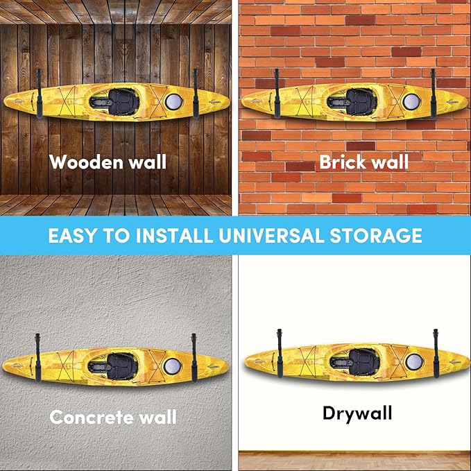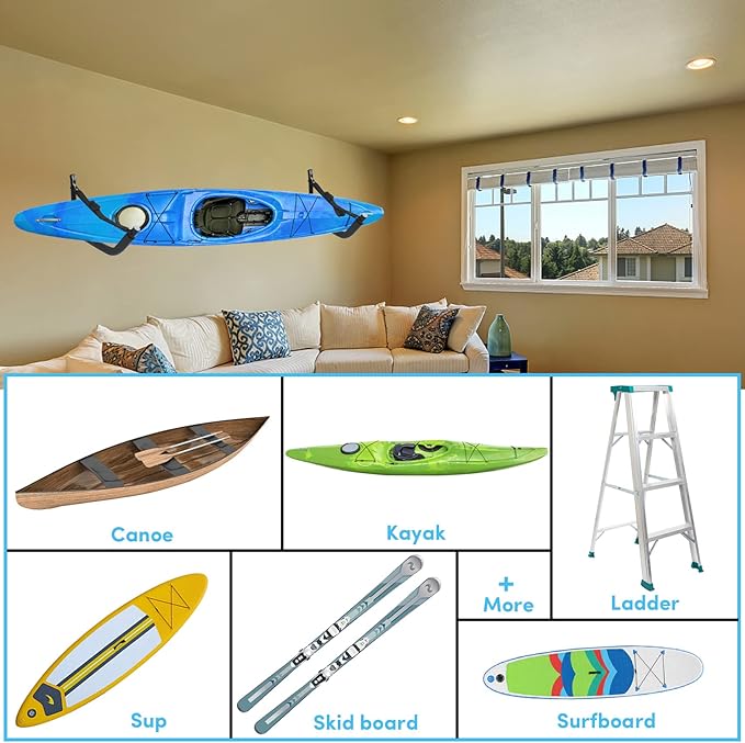 - 【Versatile Storage Options】Kayak storage racks for garage can be used to hang kayak, canoe, SUP, snowboard, skateboard, surfing board.And kayak storage brackets can also be used to store other bulky items such as folding chairs, ladders, bikes, tools, garden hoses, lumber and other bulky items,which is practical and convenient.kayak wall mount with strap can be used to store items indoors and outdoors.