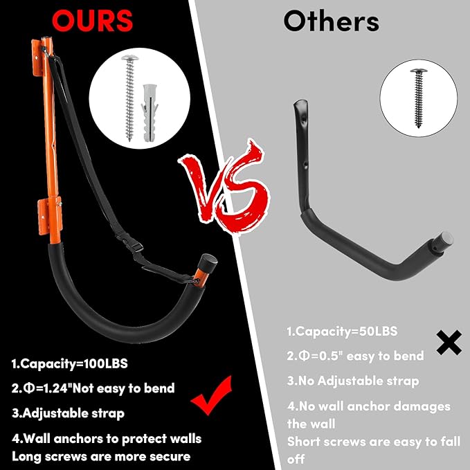 • 【Space-saving Kayak Wall Mount Storage】 The package includes 2 kayak rack storage, 14 screws and 12 anchors, the updated screws are longer and stronger . Kayak wall mount hooks Suitable for indoor or outdoor use in the garage, shop or home. Kayak hanging rack fit neatly on drywall, wall studs, and other wall types, freeing up space on the ground.