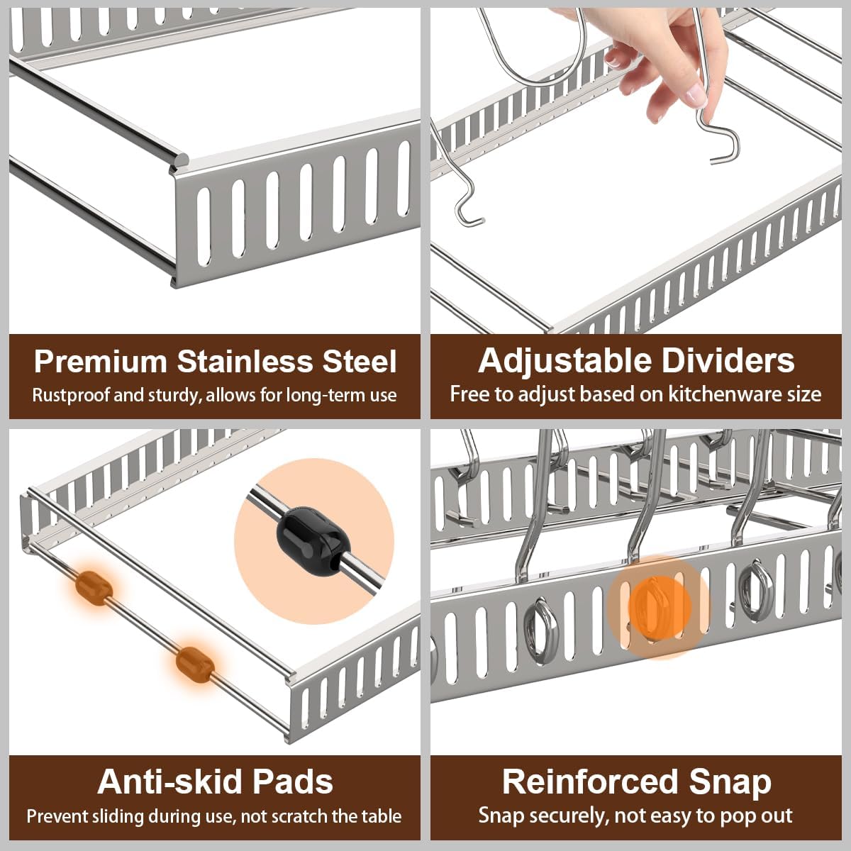 - Special Feature : 14 Adjustable Dividers: This pot lid organizer holder comes with 14 adjustable dividers, It can hold up to 13 pans, and you can adjust the width according to the size of your pots and pans or other kitchen cookware., 2 DIY Methods: This pot rack has 2 DIY methods. You can use it as a expandable organizer or two separate pot lid racks. The length can easily expands from 12'' to 23'', which allows the flexibility to store in a pantry, cabinet, under the sink, or on countertop., Durable Material: Our pot and pan organizer rack is made of heavy duty stainless steel, It's designed to hold even your heaviest cast iron pans. It is extremely robust and durable., Keep Your Countertop Tidy: Our pot organizer rack will help keep your pots, pans, lids, trays, plates, cookie sheets and cutting boards well organized and easy to reach., Pot and Pan Organizer Rack for Cabinet Pot Lid Organizer Pot and Pan Holder Rack Storage Organizer for Kitchen Cabinet 14 Adjustable Dividers: This pot lid organizer holder comes with 14 adjustable dividers, It can hold up to 13 pans, and you can adjust the width according to the si… See more