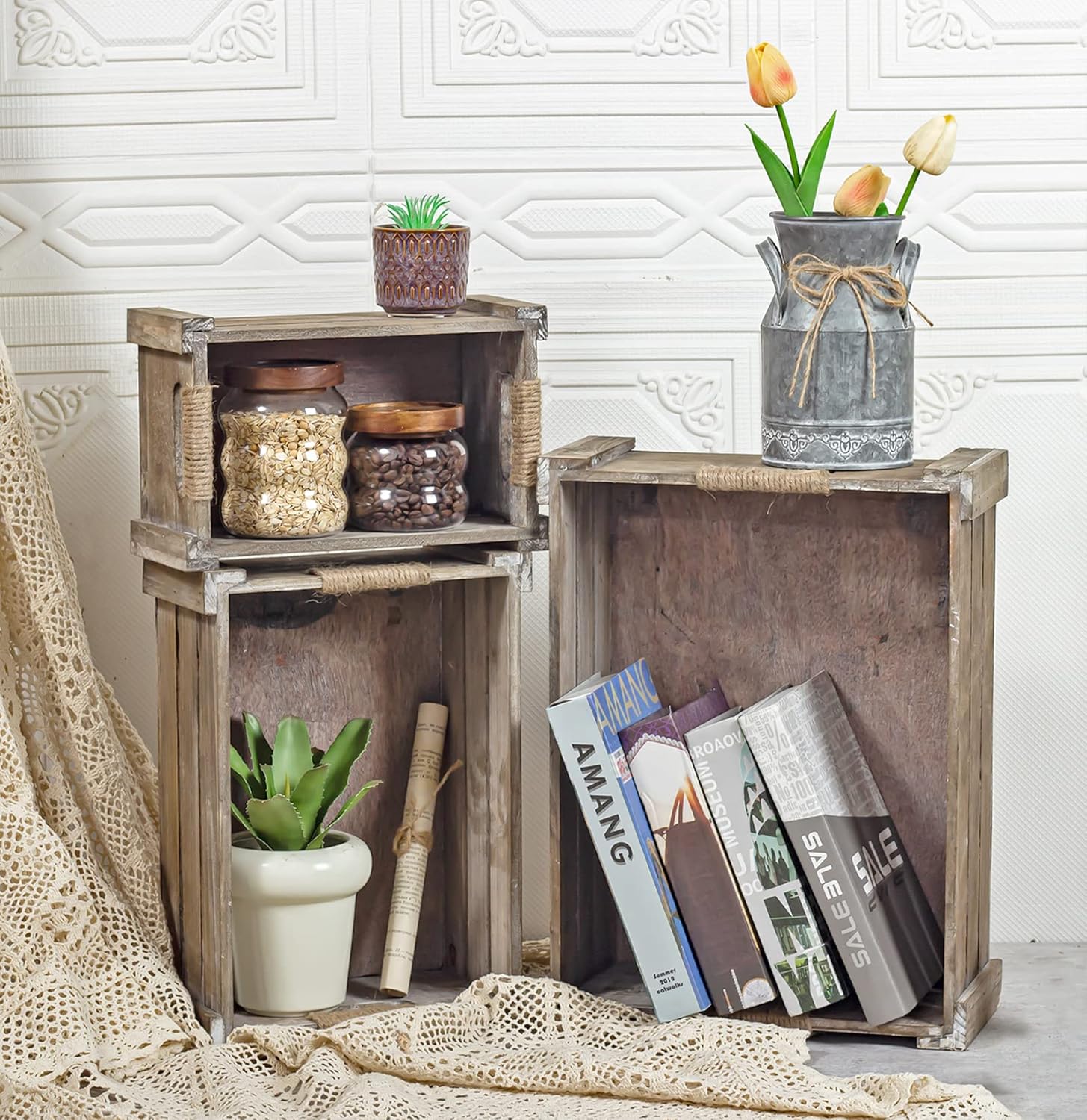 - UNIQUE DESIGN – The rectangular nesting crates have natural wood grain and knots on the surface, so each crate is unique, the farmhouse jute rope cutout handles make them easy to carry around.