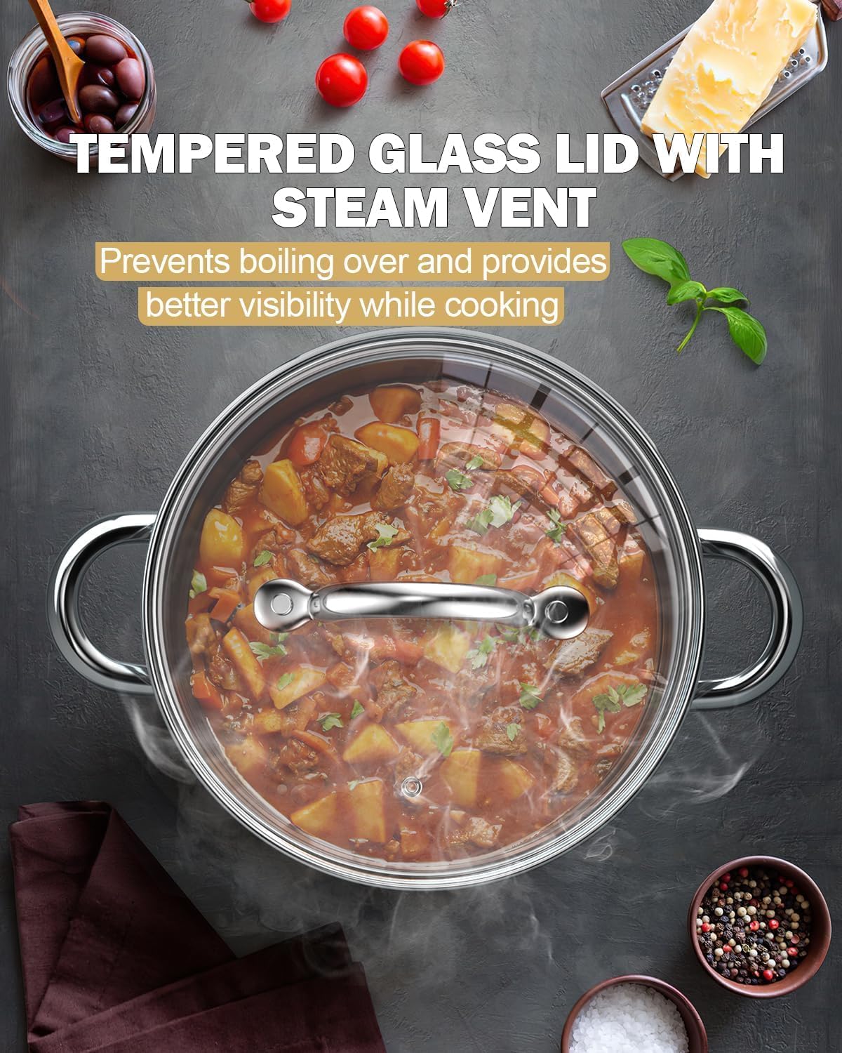 - Glass Lids and Comfortable Handles: The tempered glass lids a steam vent to view food while cooking; Riveted stainless steel handles are durable, comfortable, and wide/deep for a secure grip
