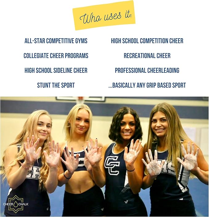 • MAXIMUM GRIP STRENGTH ~ Grip strength is essential in cheerleading, weightlifting, rock climbing, gymnastics, and other athletic activities. Cheer Chalk increases friction and instantly absorbs sweat moisture, leaving your hands feeling grippy and completely dry. A stable grip helps to increase safety for athletes both on the ground and in the air.