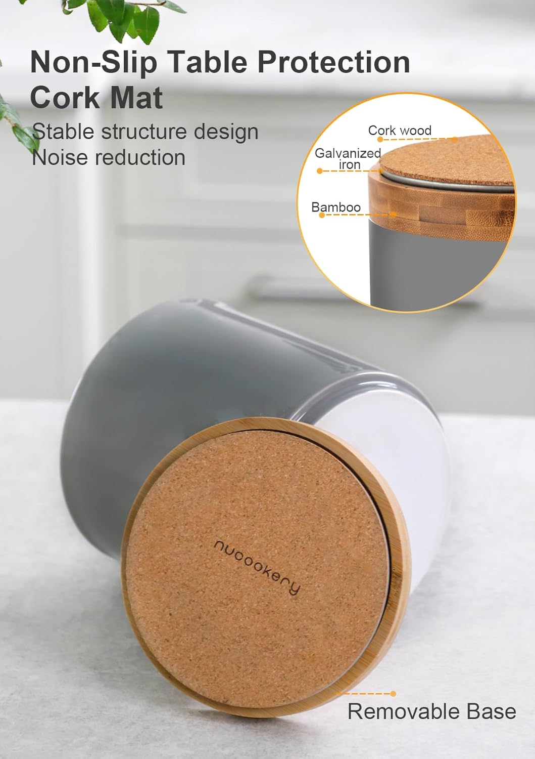Nucookery 360° Rotating Utensil Holder, 7.2" Large Utensil Crock, White Ceramic Cooking Utensil Organizer with Countertop-Protection Cork Bottom for Farmhouse Kitchen Decor Gift (Gray)