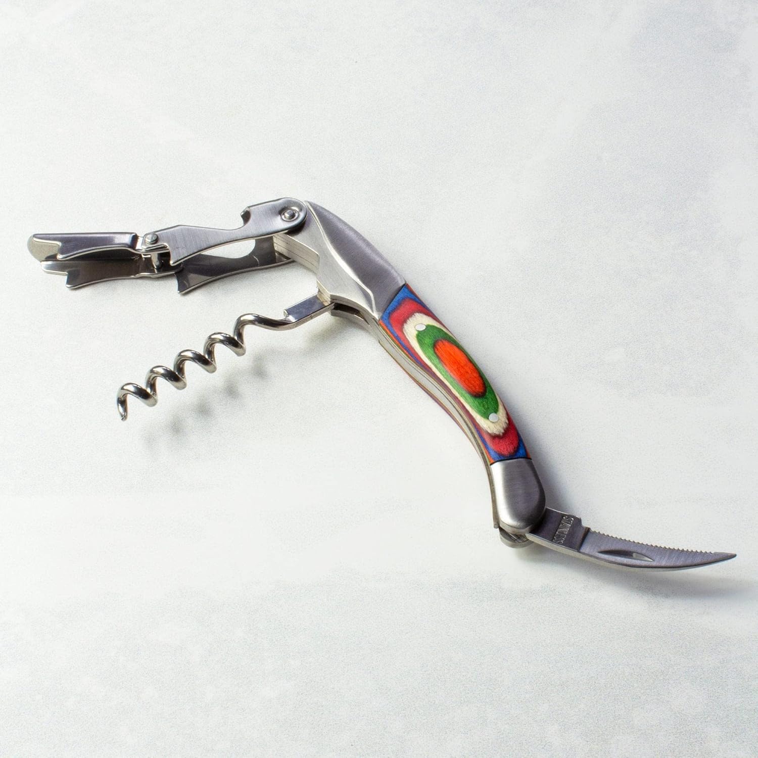 - BEAUTIFUL & FUNCTIONAL: Durable waiter's friend multifunctional tool includes a stainless steel wine corkscrew, serrated stainless steel foil cutter and stainless steel bottle opener all with a multi-colored wooden handle that provides a comfortable, sturdy grip