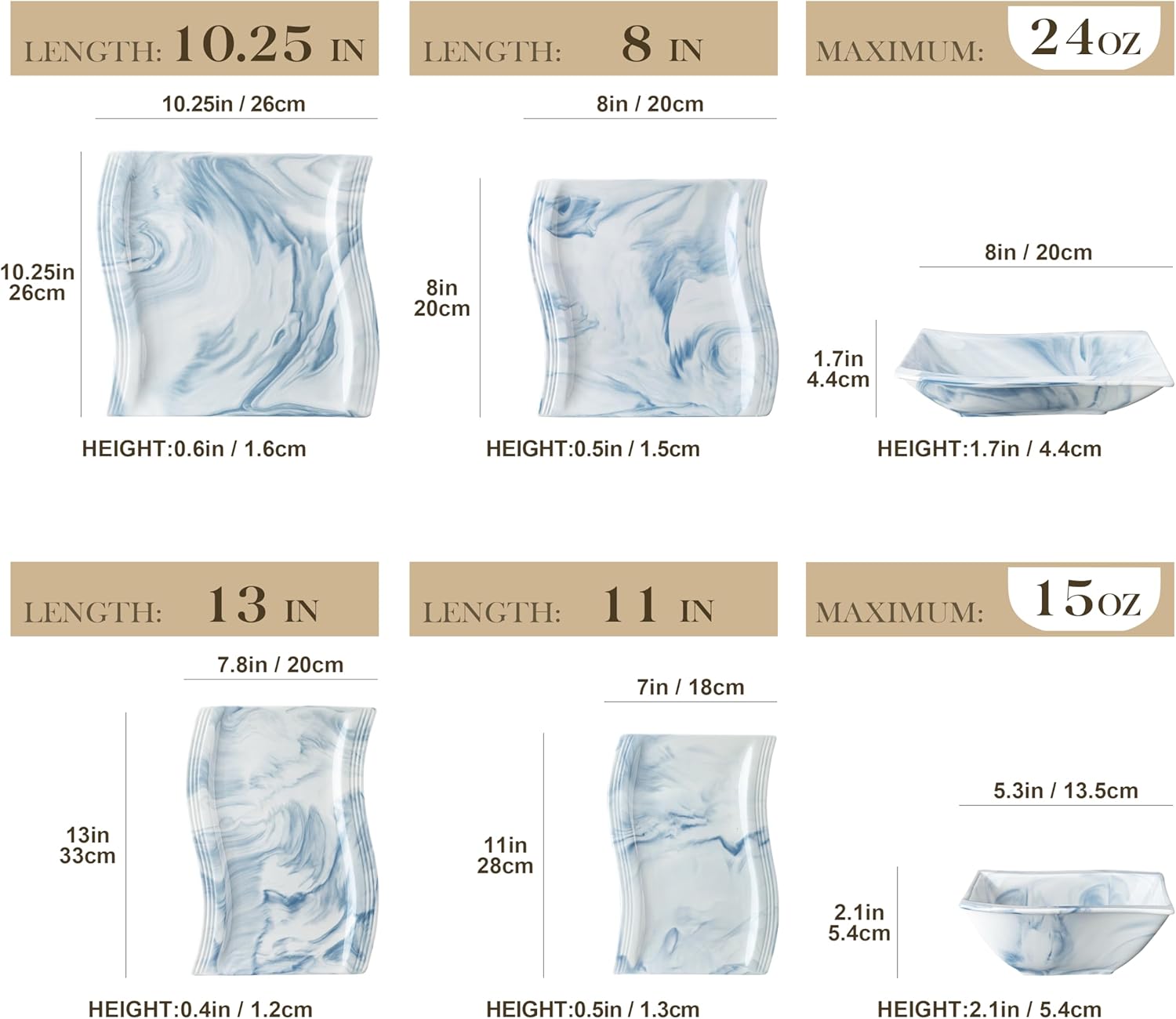 - Elevate Your Dining Experience -- MALACASA dinnerware sets for 6 include includes 10.25'' dinner plates, 8 '' dessert plates, 24 OZ soup plates, 15 OZ cereal bowls, 2 piece 11” and 13” rectangular serving platters. Perfect for any casual or formal dining occasions, this blue porcelain dinnerware sets provide you fabulous dining experience