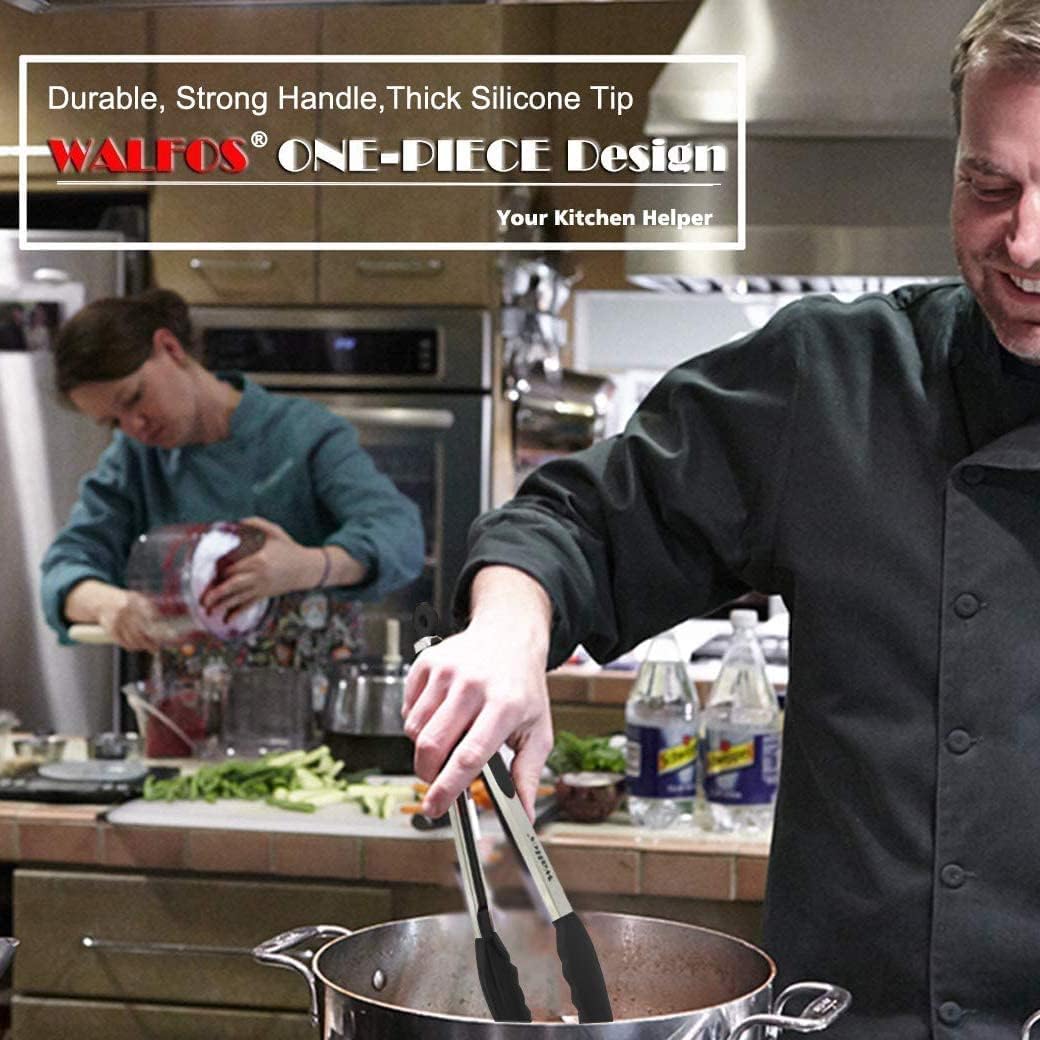 - ✓LOCKING MECHANISM & PULL-RING TECHNOLOGY -WALFOS ring-pull technology will keep your tongs from opening and closing accidentally which will allow you to facilitate better control while using them. And can be conveniently dried and stored.The set of 3 Pcs Cooking Tongs- Small 7 inch is perfect for all your needs.