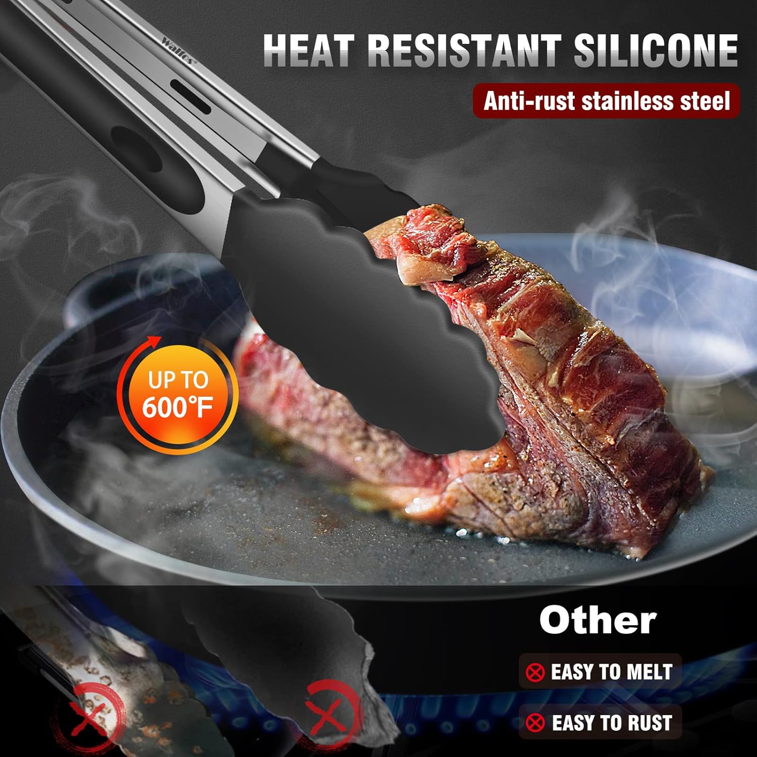 - ✓NON STICK SILICONE TIP, 7 Inch Small Tongs for Cooking won't MELT, RUST OR FLAKE-The tip is made of food-grade and BPA free silicone, which is safety-tested, heat resistant up to 600°F and will never rust. Small Kitchen Tongs with non-stick silicone tips protect your cookware from damage, easy to clean and dishwasher safe. Great for Salad Cooking.
