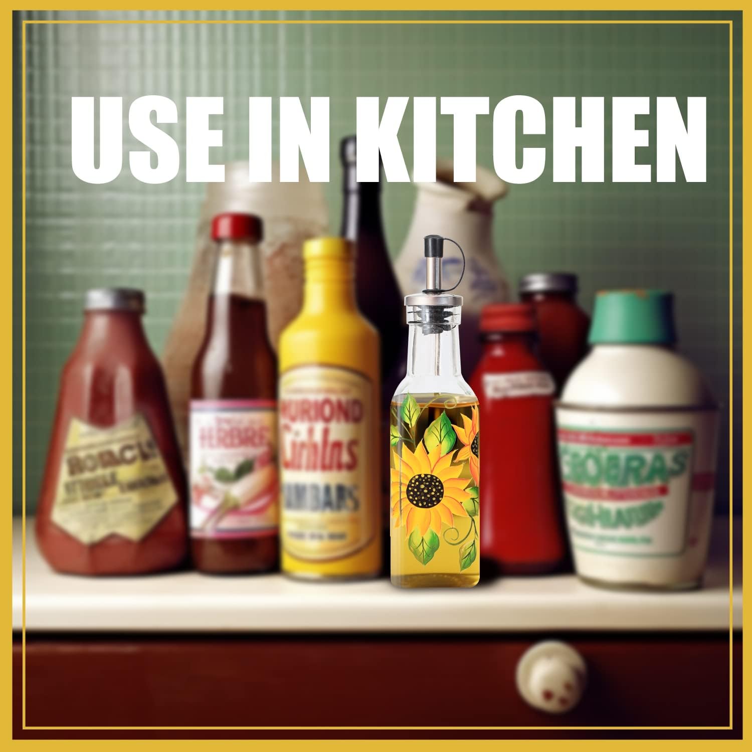 7oz Hand Painted Glass Olive Oil Bottle Dispenser - 200ml Green Oil & Vinegar Cruet with Pourers - Olive Oil Carafe Decanter for Kitchen (Sunflower)