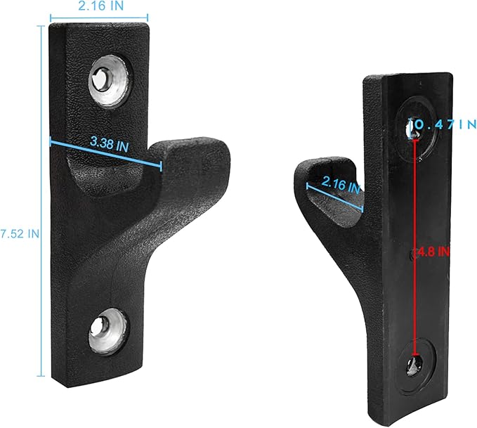 - Wall Mount Barbell Rack - Including all accessories to attach on wall, keep your bars well organized. Size 7.52L x 3.38W x 2.16H in, notch width 2.16 in, screw hole diameter 0.47 in, distance between 2 holes 4.8 in, weight 60.81 oz per pair