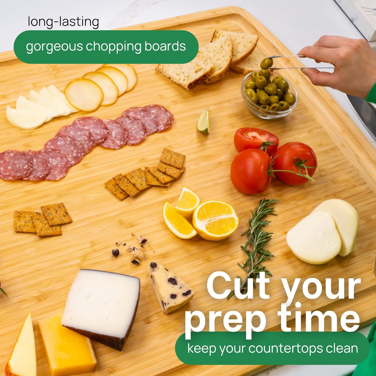 - SUSTAINABLE & GUARANTEED FOR LIFE – Made from 100% eco-friendly bamboo, naturally non-porous and reversible for safe food prep. Backed by our Lifetime Replacement Guarantee for worry-free use in every kitchen.