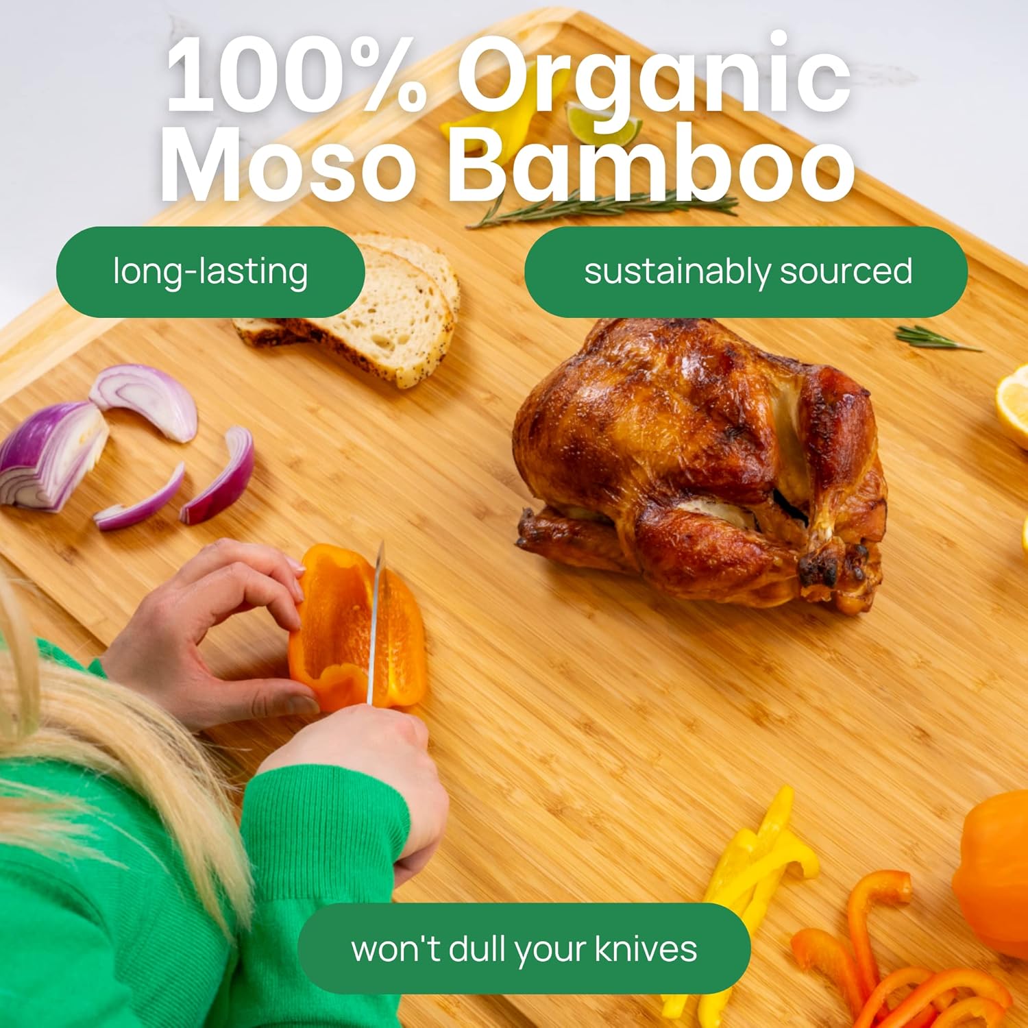 - Our bamboo cutting board is the embodiment of our commitment to sustainability and customer satisfaction. Designed in the USA, it’s made from sustainably sourced Moso Bamboo, reflecting our dedication to environmentally friendly kitchenware. Ideal for home chefs and professional kitchens, this cutting board represents a blend of quality and responsibility, making it a perfect addition to kitchens that value both function and eco-consciousness.