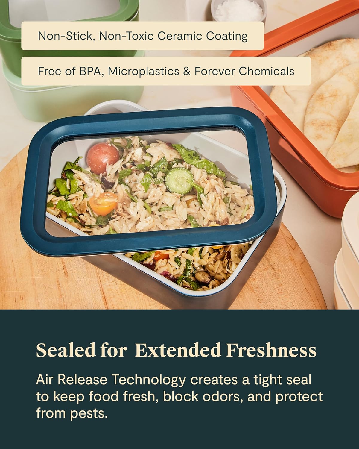 - BEAUTIFULLY DESIGNED: The cleanest, best-looking approach to storing your food. Our glass container features a clear glass lid for easy viewing Each container comes in modern colors that will match with your entire Caraway collection.
