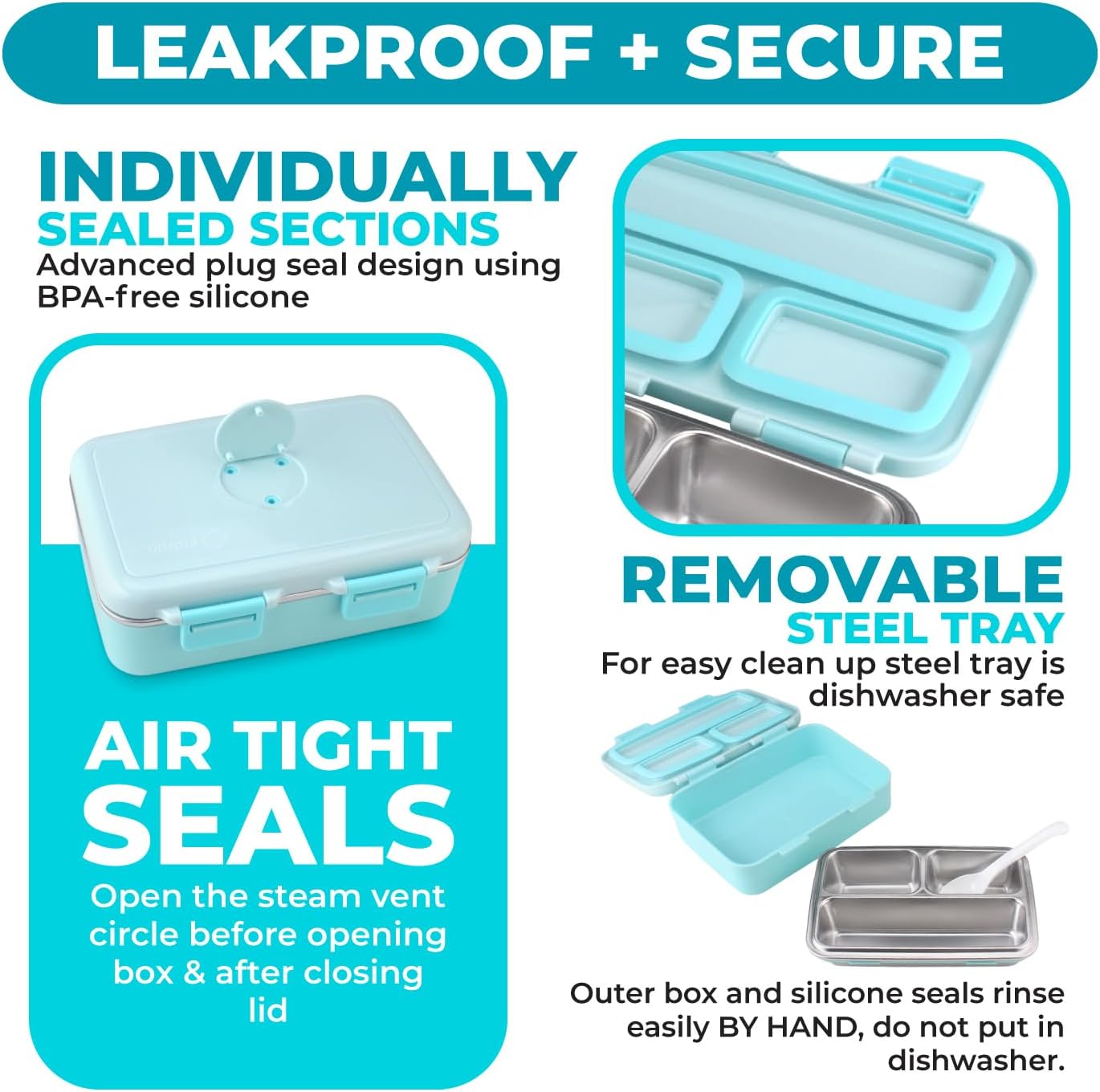 - REMOVABLE STEEL TRAY for easy clean up. Our Japanese grade SUS304 stainless steel tray is dishwasher safe and highly corrosion resistant. Easily wash the outer box and silicone seals by hand. NOTE these maintain temperature longer than lunchboxes with no insulation but will NOT provide thermos-like warming.