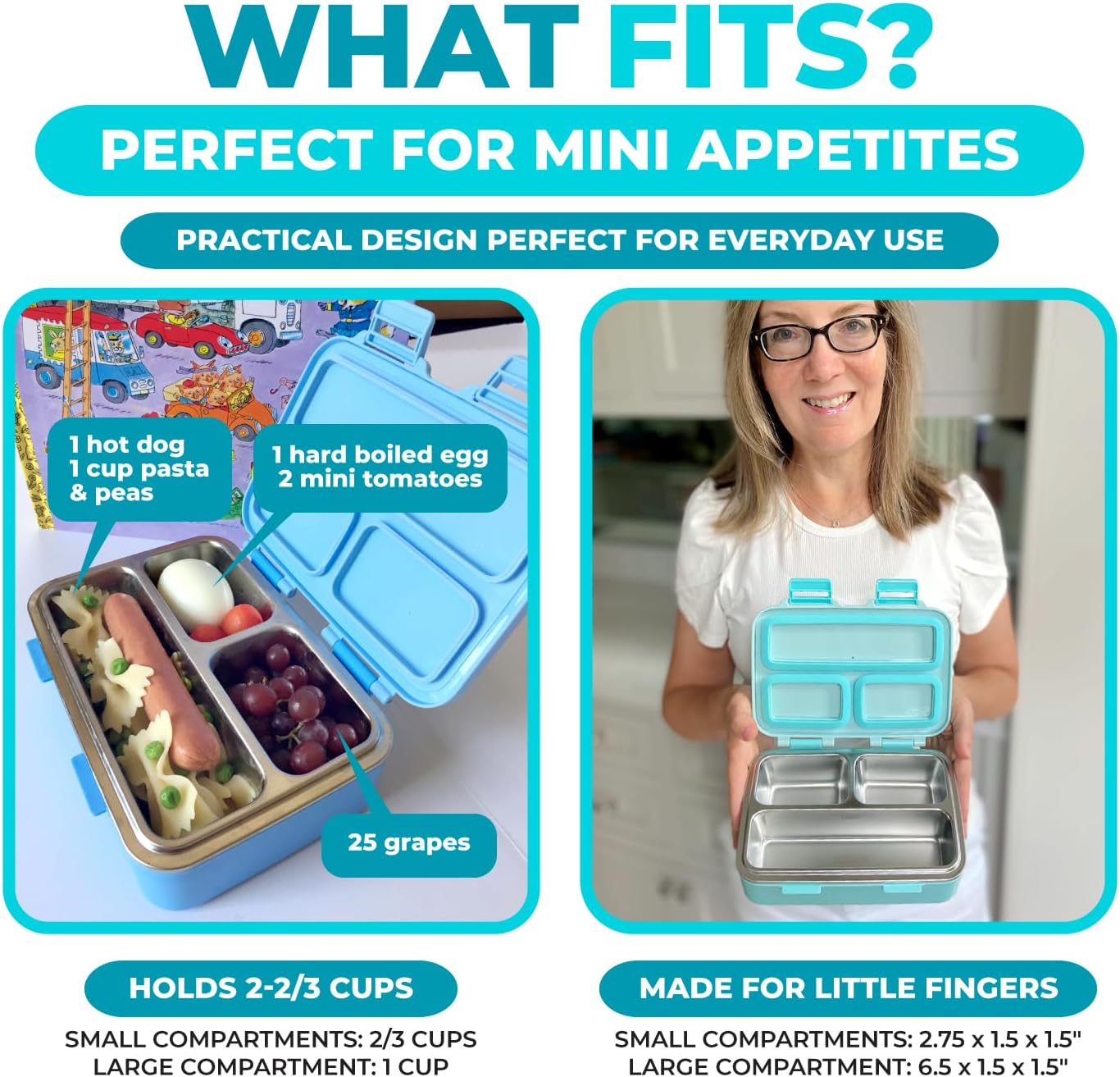 - PREMIUM MINI Steel Bento Box – A fun way to send your toddlers, baby and young children to daycare or preschool with a healthy lunch. This travel-friendly lunch box features 3 stainless steel section compartments sealed individually with high-grade silicone seals to keep food fresh. Includes spork. BPA and phthalate free. AGE 3+