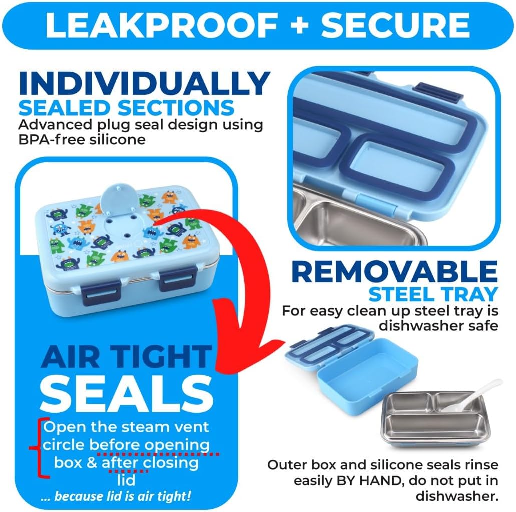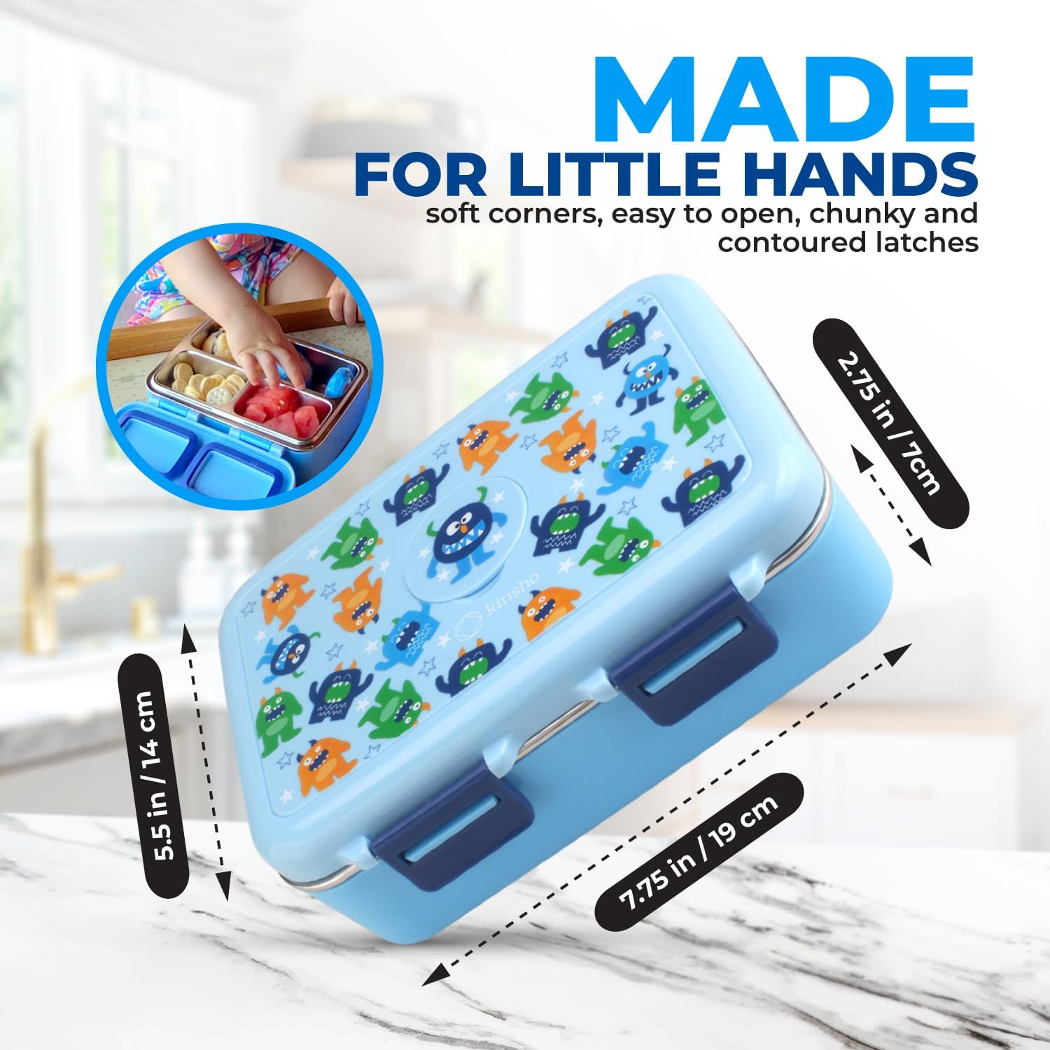 Stainless Steel Lunch Box for Baby Toddlers Boys, Mini Bento, 3 Eco Metal Portion Sections Leakproof Lid, Pre-School Daycare Lunches, Kids Spill-Proof Snack Container, 18 oz/ 550 mL Blue Cute Monster