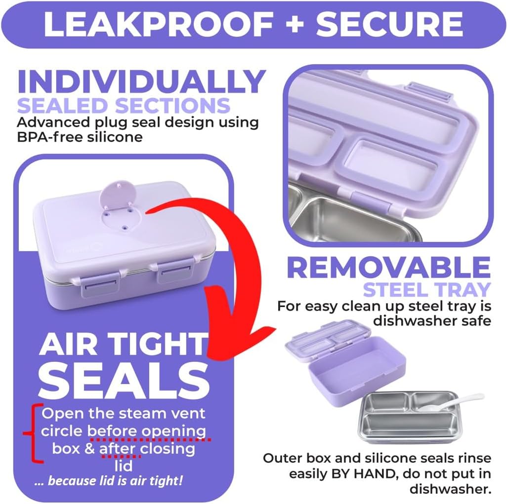 - HEAVY-DUTY Leakproof Container – Along with a sturdy spill-proof design and easy-open latches for small hands these bento boxes for kids lunches are insulated in the lid with an AIR RELEASE CIRCLE. Open this FIRST, before the lid and then close after the lid is shut for a secure seal. You will HEAR THE AIR releasing when opening and closing properly - this confirms it is air tight. The air release circle is a closed system and will DRAIN any water that enters from washing up, simply air dry with vent facing down.