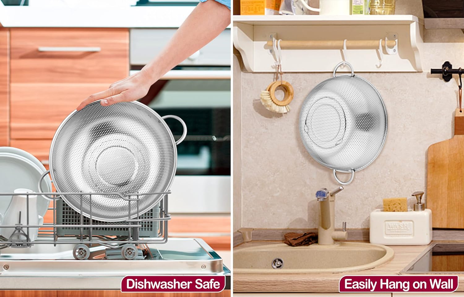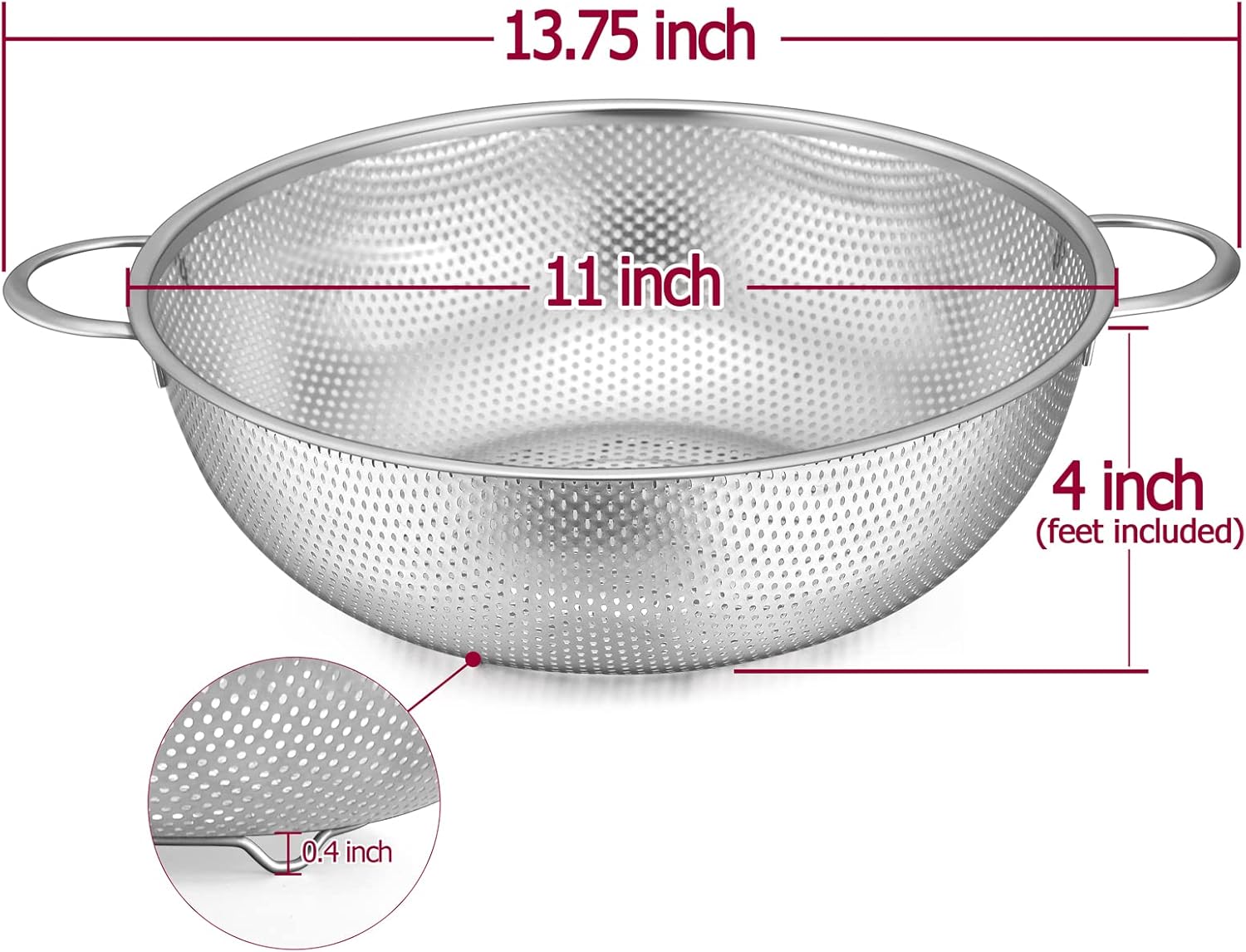 - QUICK DRAINING – Closely spaced holes on the whole surface for draining water faster and without tilting the metal strainer to avoid the food flowing out, Tiny holes for no worry about small foods(nuts, spaghetti, noodles) slipping through
