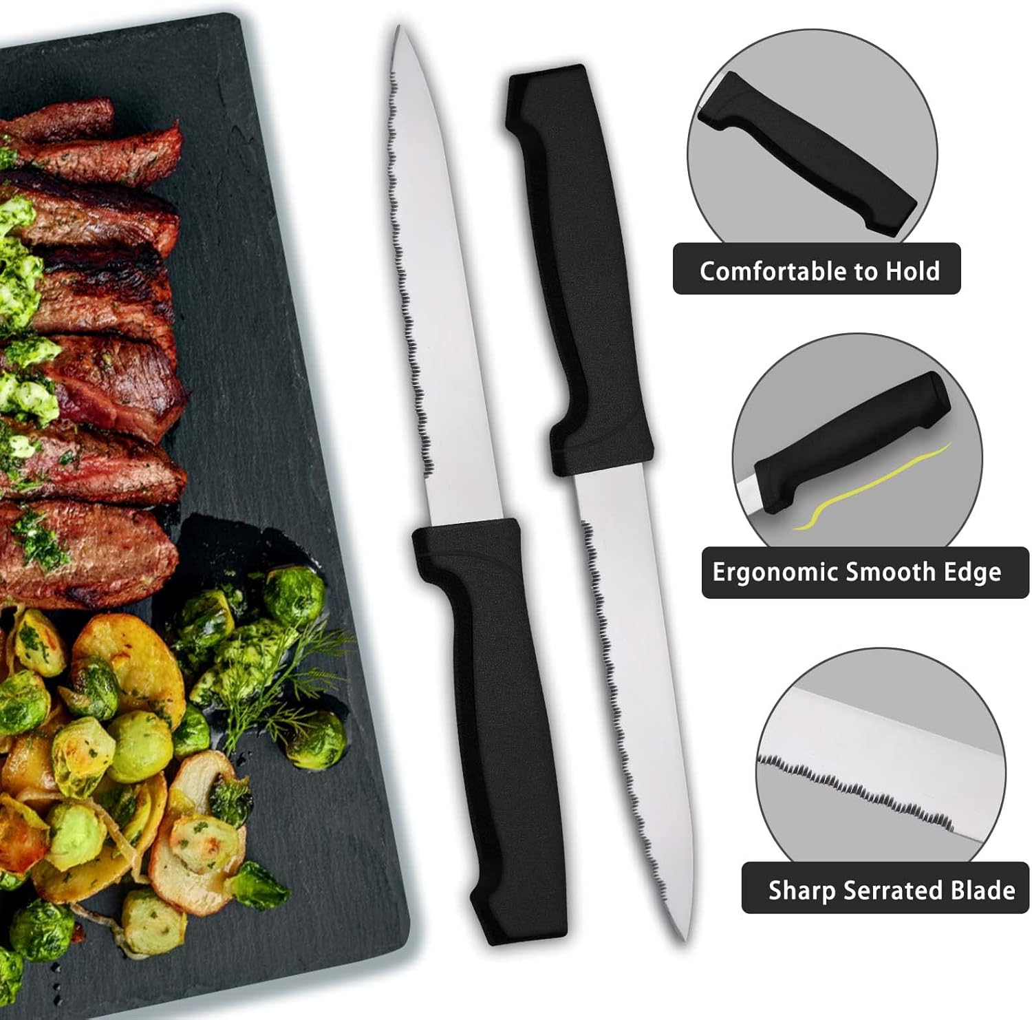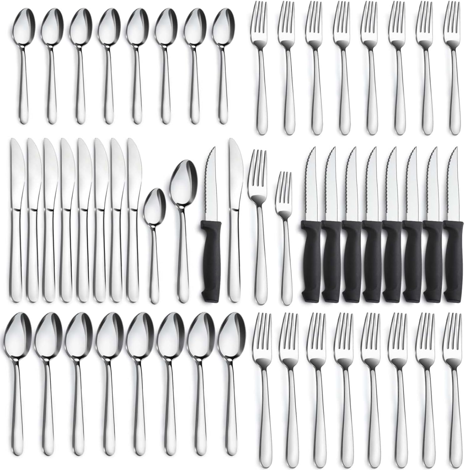 - 【48-Pieces Flatware Set For 8】Our 48 pieces silverware set contains 8 dinner spoons, 8 teaspoons, 8 dinner forks, 8 salad forks, 8 dinner knives and 8 extra steak knives, so you don't have to buy steak knives separately. The cutlery set is also an irreplaceable dining tool whether it is for daily use or for preparing dinners or parties
