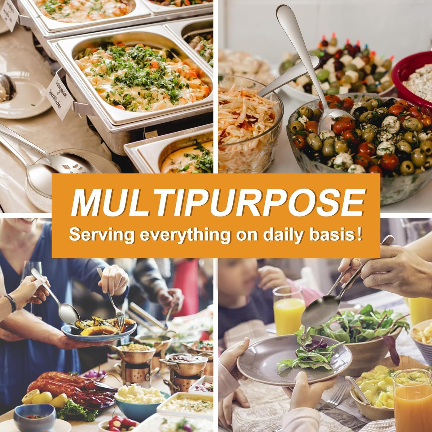 - 【High Quality & Durable】These serving utensils adopts a strong structure, made of food-grade stainless steel that the serving spoons are solid, corrosion-resistant, rust-resistant, no smell,no bending. Ensuring you enjoy the food safely and provide you with a durable serving spoon set that can be used for many years. What's more, these spoons are dishwasher safe