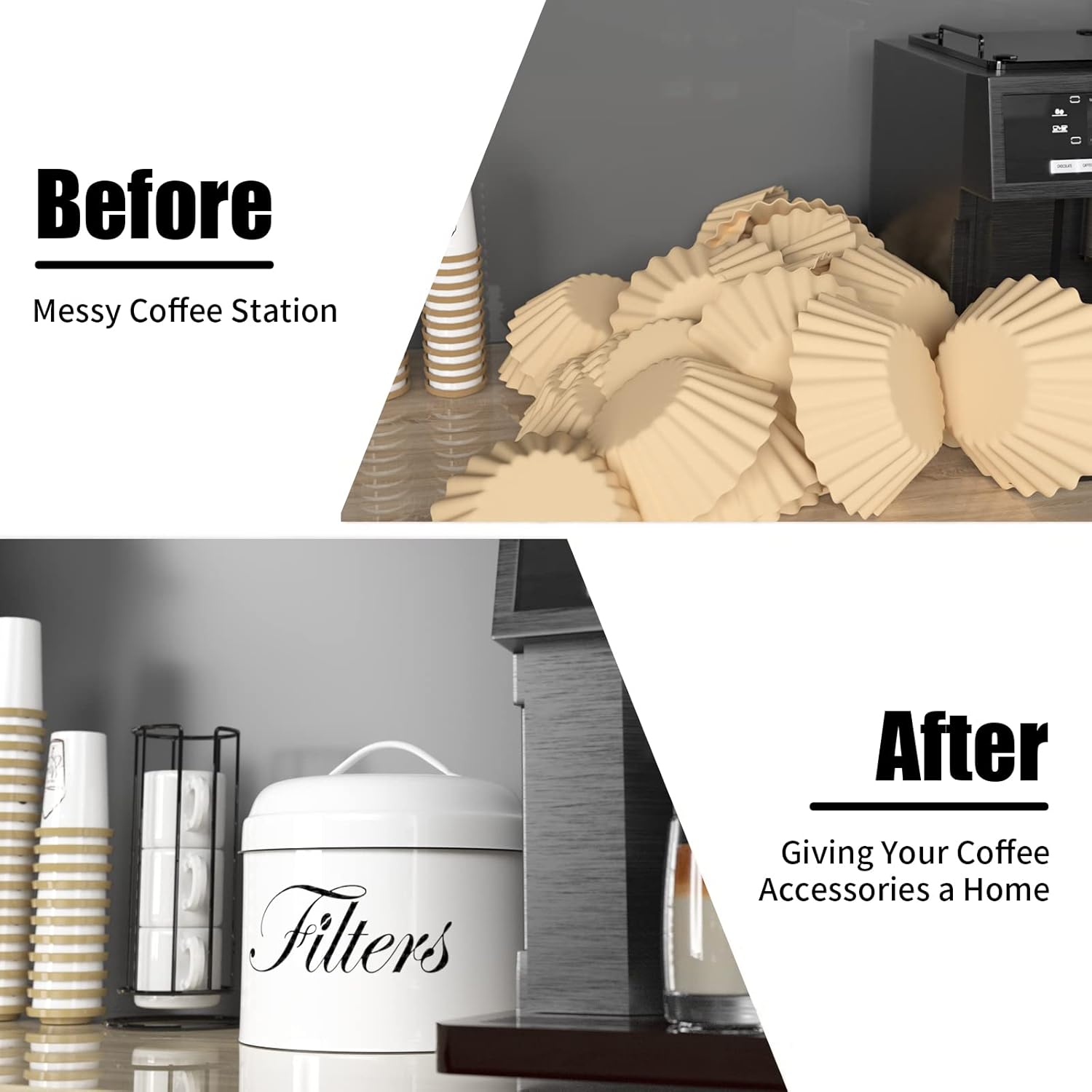 - COFFEE BAR DECOR ACCESSORIES : This coffee filter storage is great way to hide unsightly coffee filters without taking up space anymore! It is a nice addition to your coffee bar decor. The round can be placed anywhere near the coffee machine, on the counter or on a shelf, it is easier to reach than a wall-mounted coffee filter holder and saves you brewing time