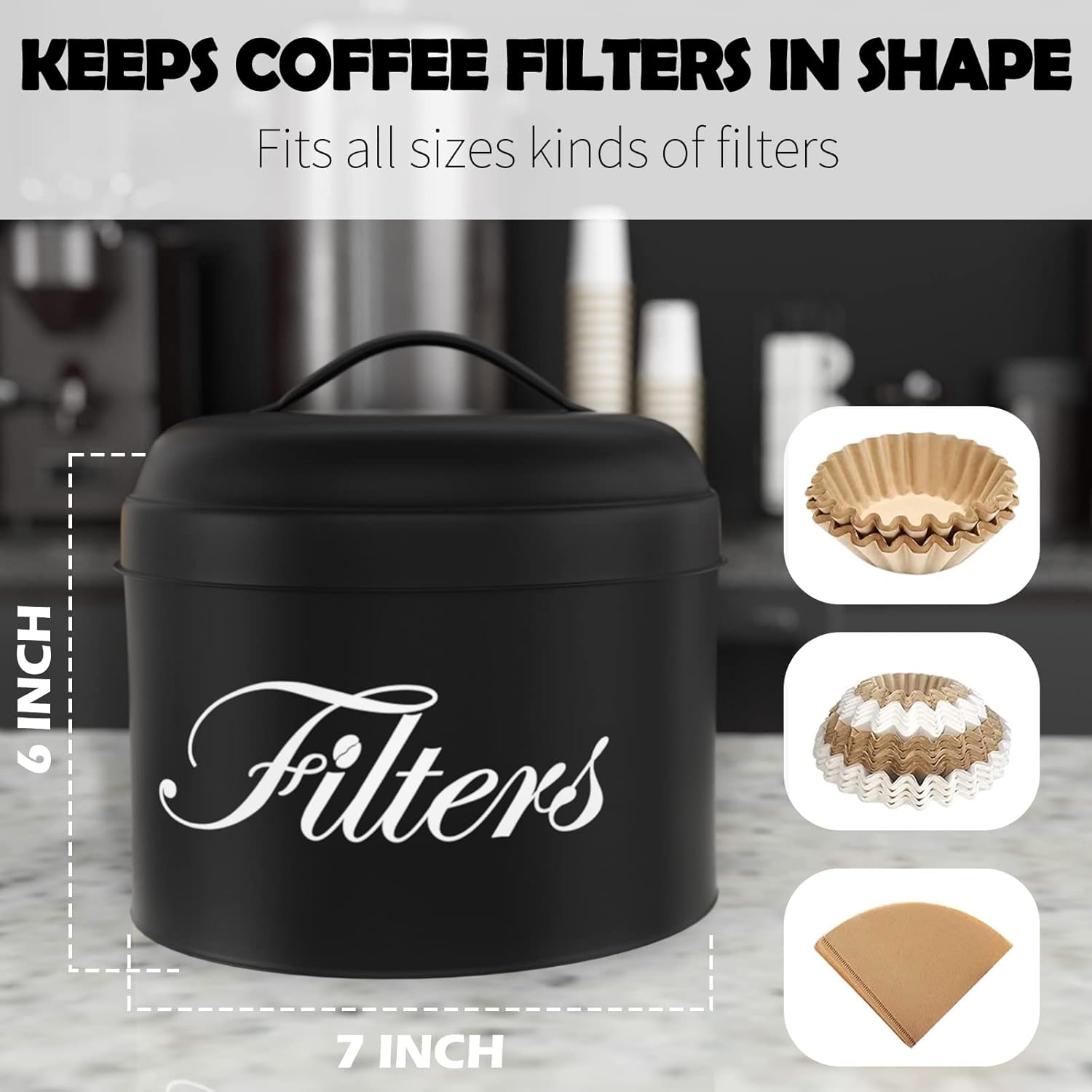- 【KEEPS FILTER FROM LOSING SHAPE】 This round coffee filter holder measures 6.2" in diameter x 6" high, large can keep your coffee filters from losing shape and adds class to your home or coffee bar. Add style and functionality with this rustic farmhouse coffee bar organizer.