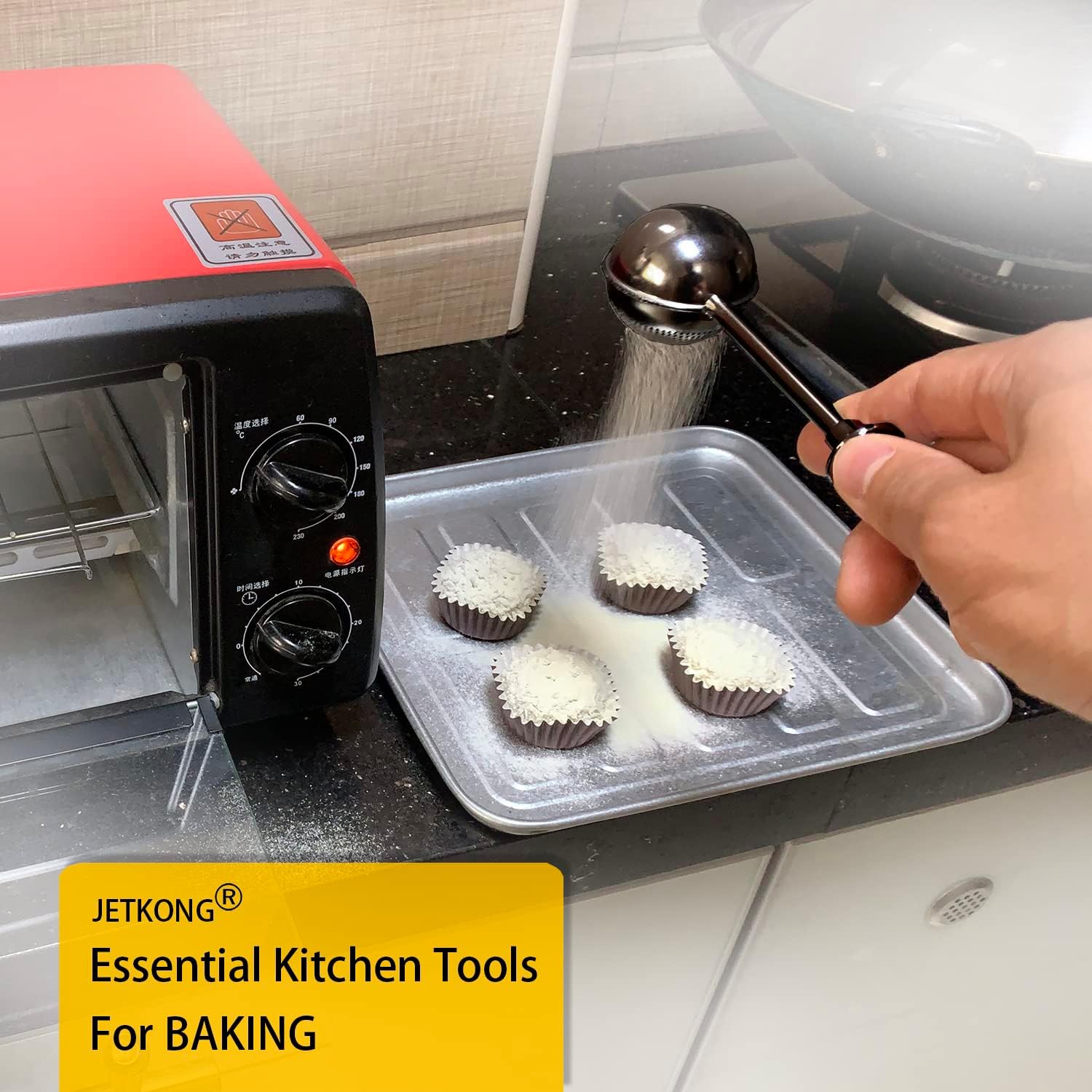 - STURDY AND WELL MADE - JETKONG sugar shaker duster is made of stiff food grade 304 stainless steel, the spring-operated handle and the round sifters welded together and rust-proof.