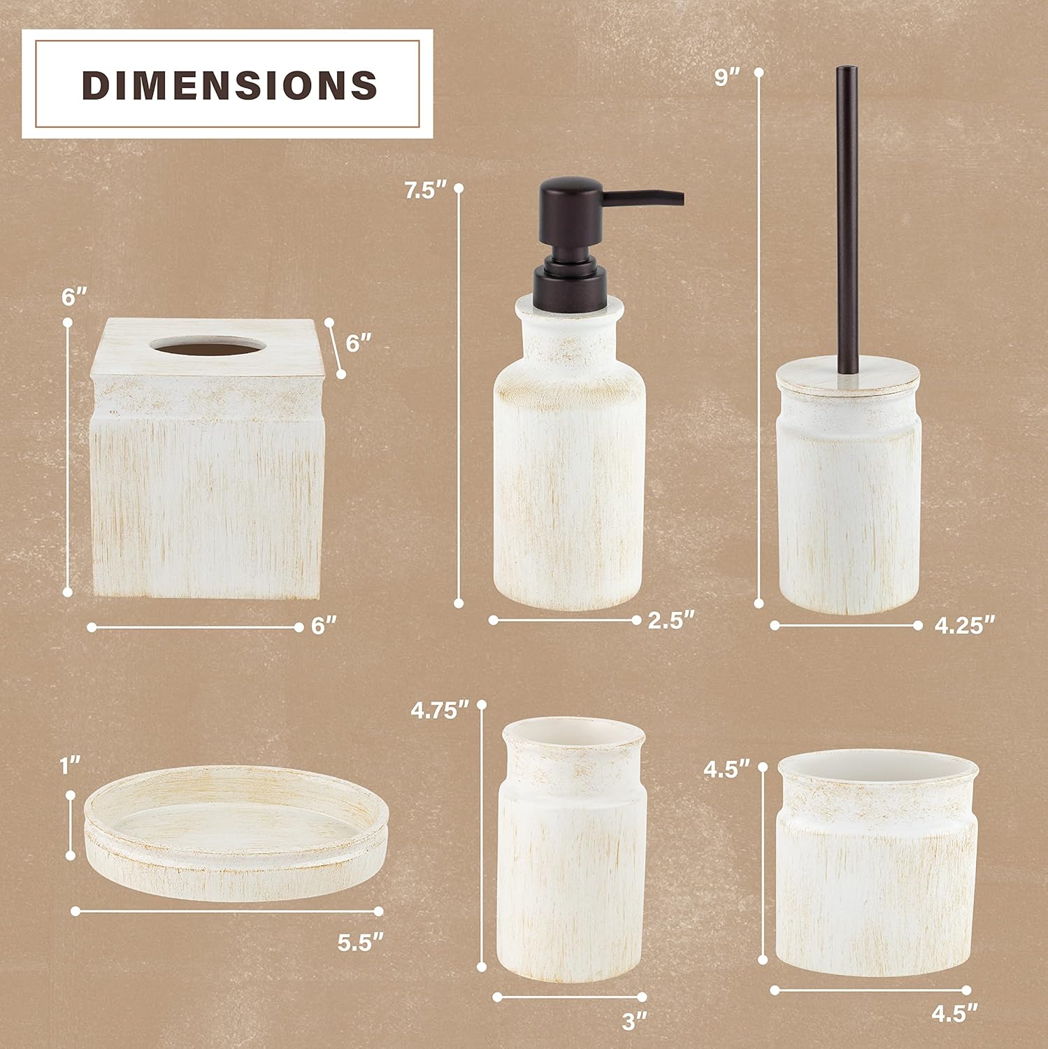 - 6 Piece Bathroom Set: Complete your bathroom with a toilet brush and holder, square tissue box cover, soap dispenser, toothbrush holder, soap holder and tumbler.