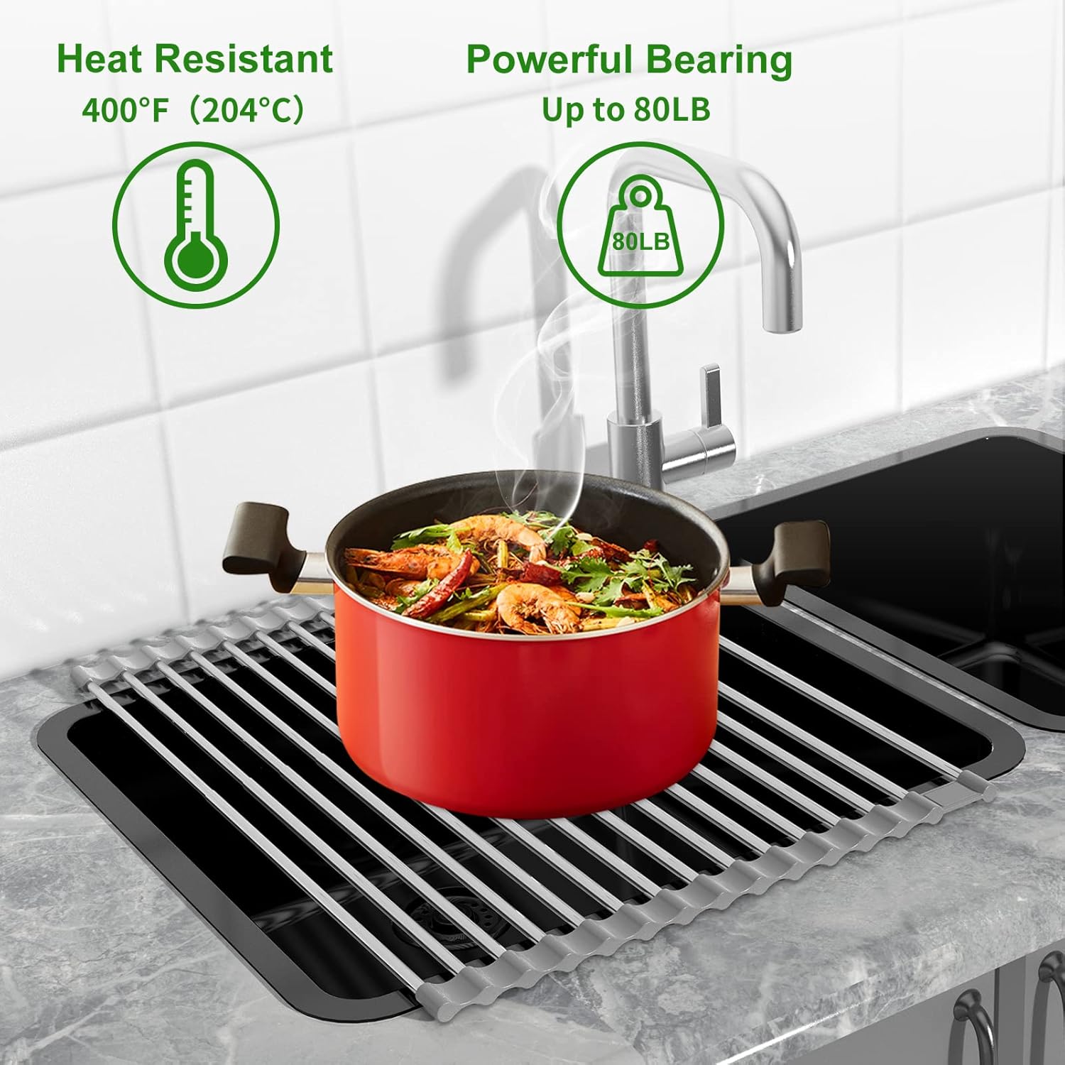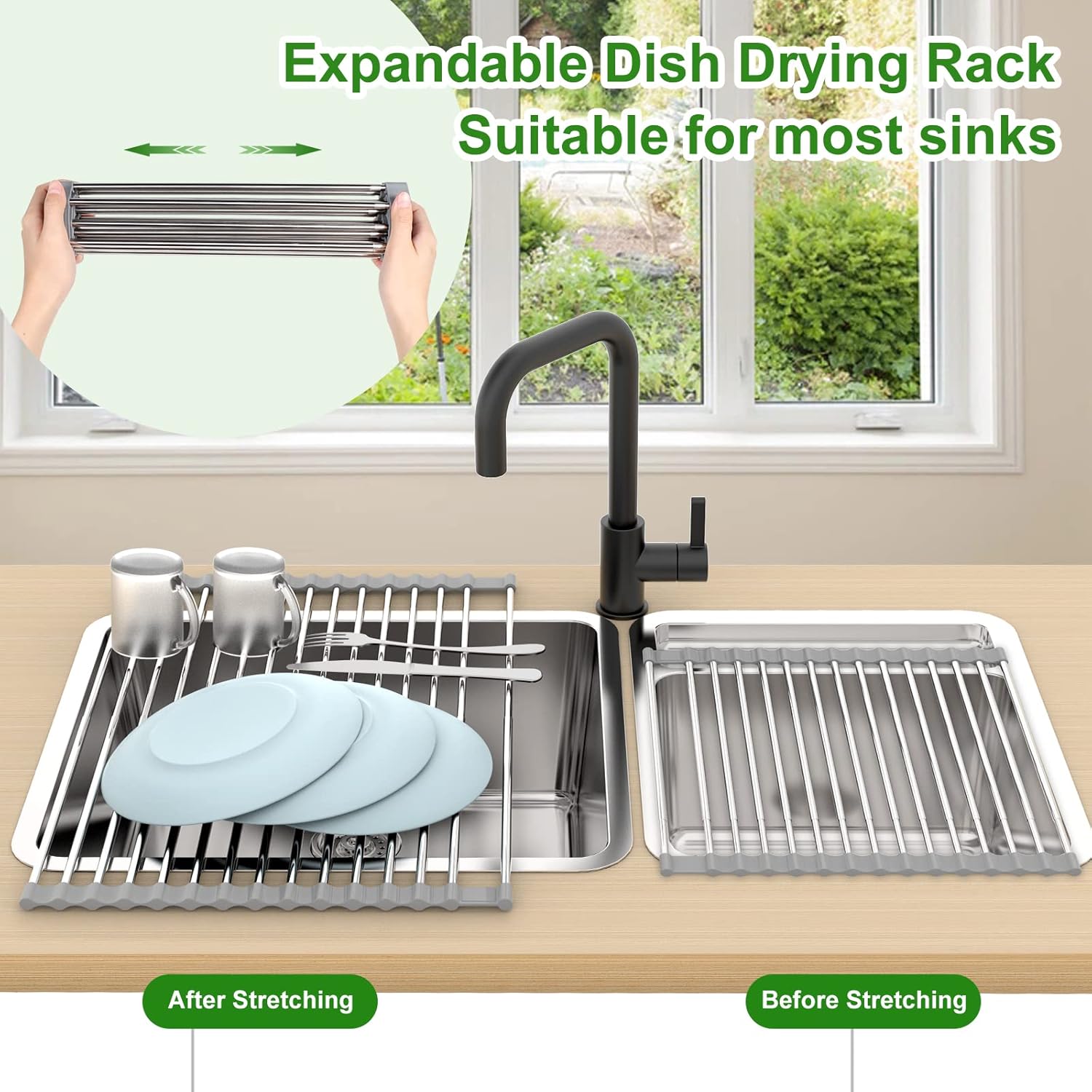 - Stainless Steel Over Sink Rack:Our over sink dish drying rack is made of 304 stainless steel, rust-resistant, heat-resistant, and corrosion-resistant.The two ends of dish rack over sink is wrapped with anti slip silicone, firmly gripping the edge of sink