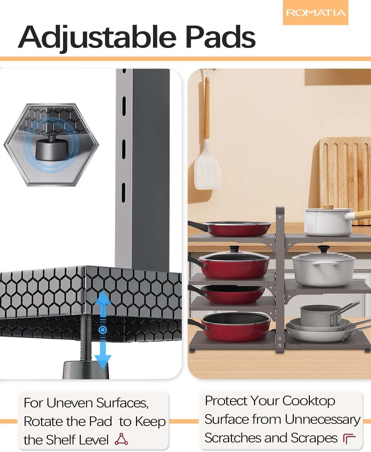 - [Excellent Details] For slightly uneven surfaces, rotate the pad on the bottom to keep the shelf level. Meanwhile, the pad can protect your cooktop surface from unnecessary scratches and scrapes. Rustproof pan holder are easy to clean.