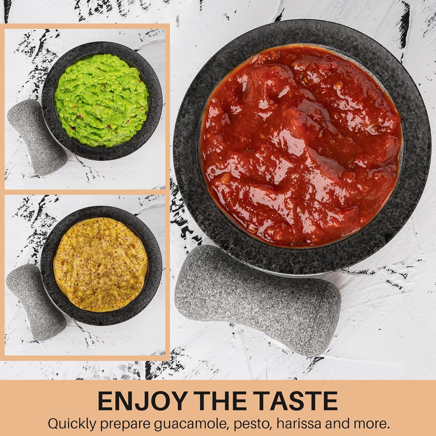 - ππππππ ππππ β The Tortilla Mortar and Pestle Set comes with a cookbook featuring 50 unique recipe ideas, instructions on how to use the mortar and pestle, and care instructions for maintaining it. The cookbook features recipes in German, English, French, and Spanish, including instructions for making Classic Pesto, Garlic Aioli, Steak with Chimichurri, Molcajete Guacamole and etc. Whether you prefer vegan, vegetarian, or meat-based dishes.
